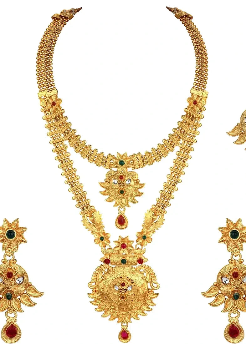 Radiating subdued elegance, this traditional Indian Artificial Gold Temple Jewellery necklace set (with 2 necklaces) is a perfect choice for Indian wedding function like haldi, the main ceremony, bridal wear jewellery and special occasions like office wear ethnic look, festivals. It is strong, resilient, and iridescent giving a smooth finish.