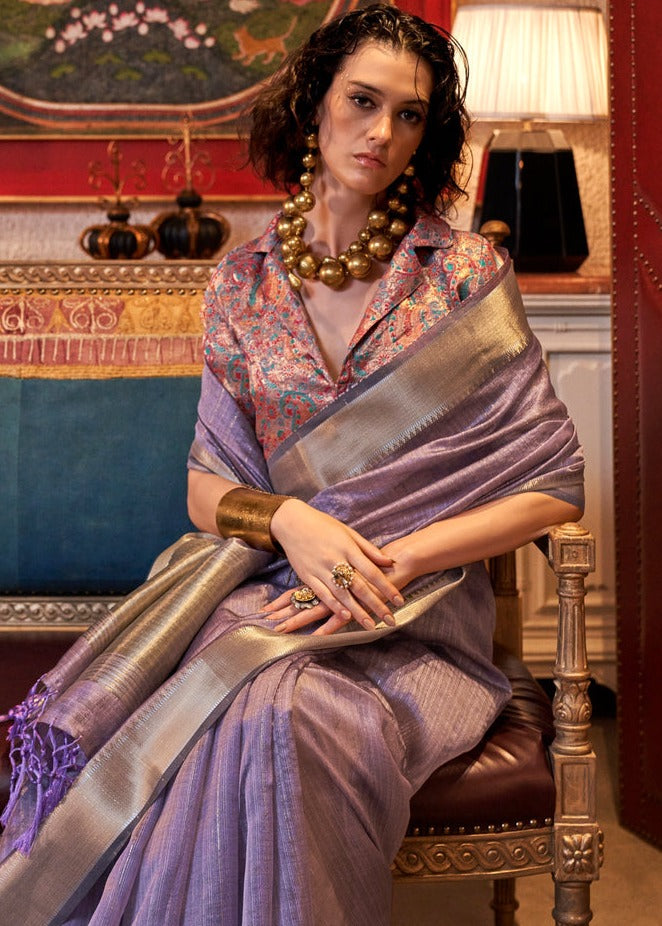 Banarasi Chiffon Purple Handloom Saree With Printed Blouse