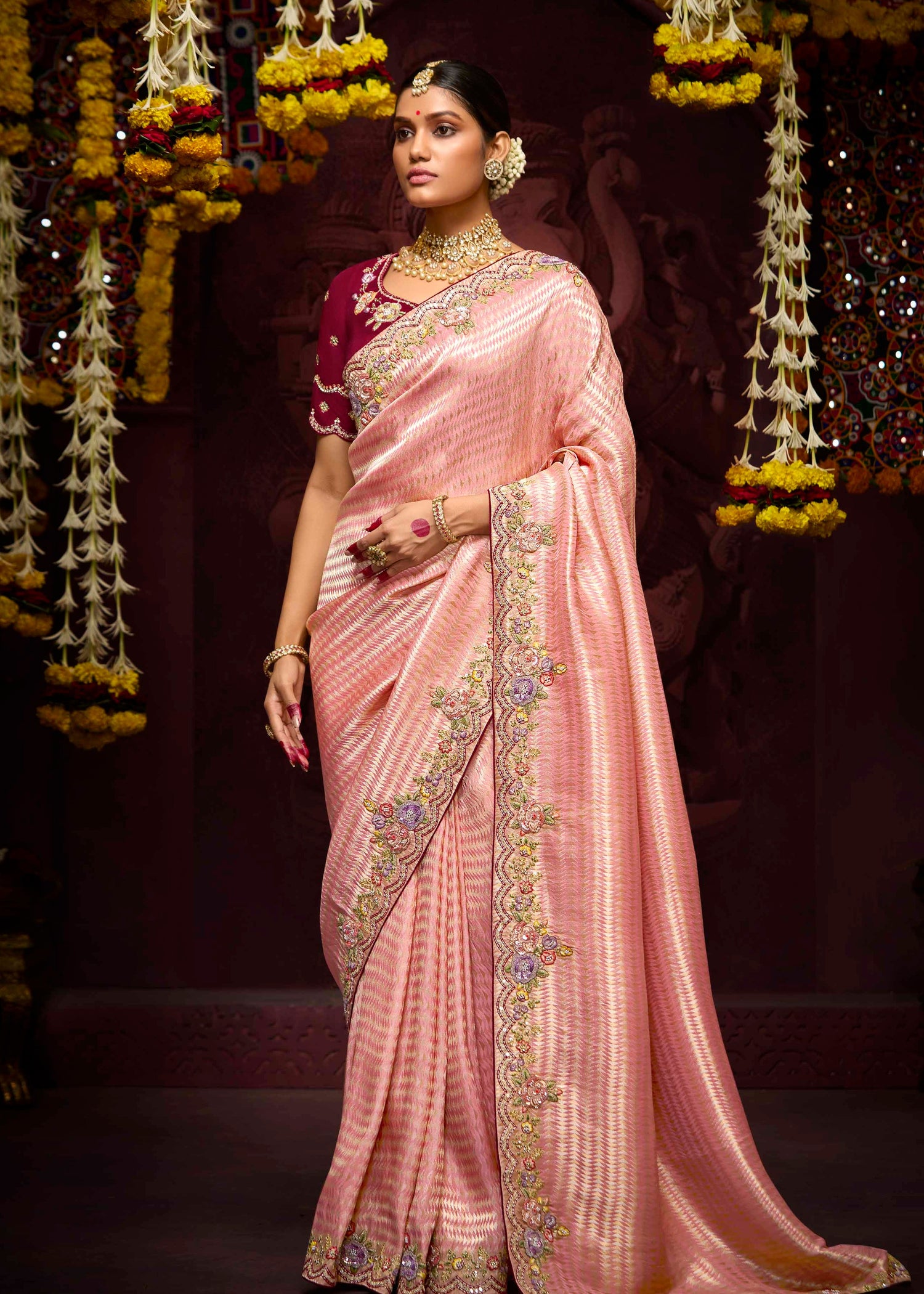 Banarasi Silk Peach Handwork Embroidery Saree with Contrast Red Embroidered Blouse
