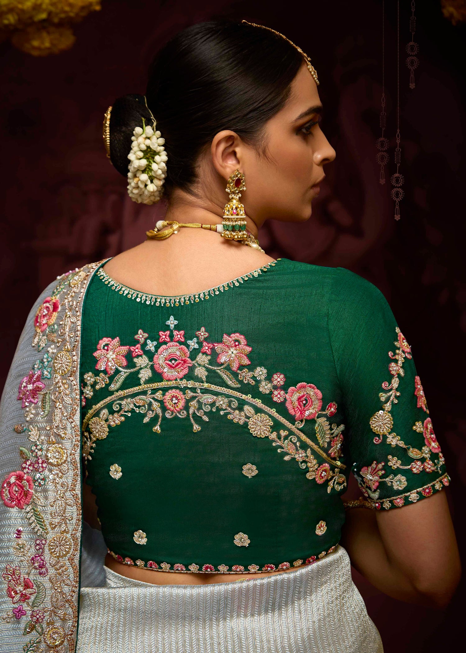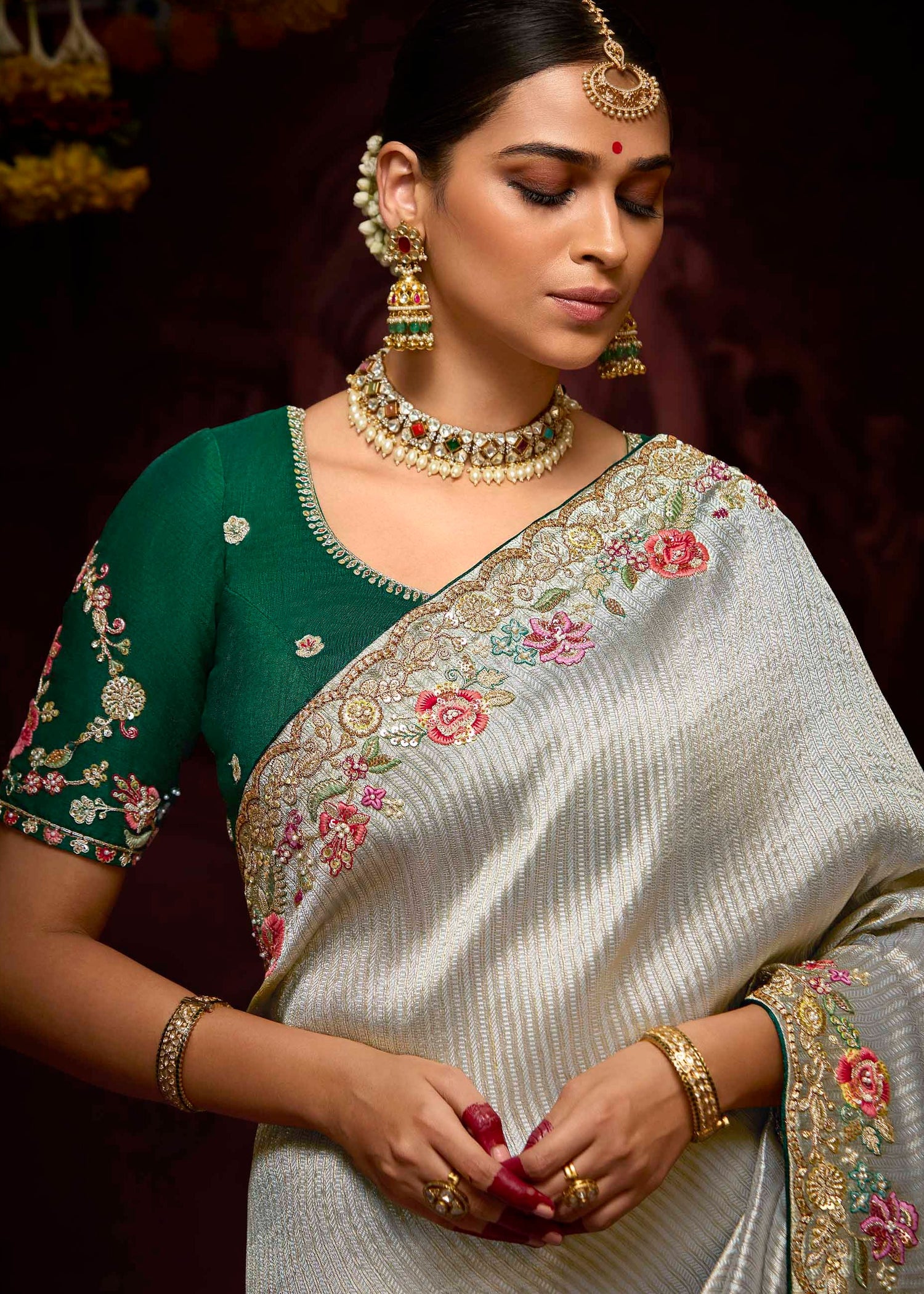 - Blouse: Contrast green blouse with detailed embroidery