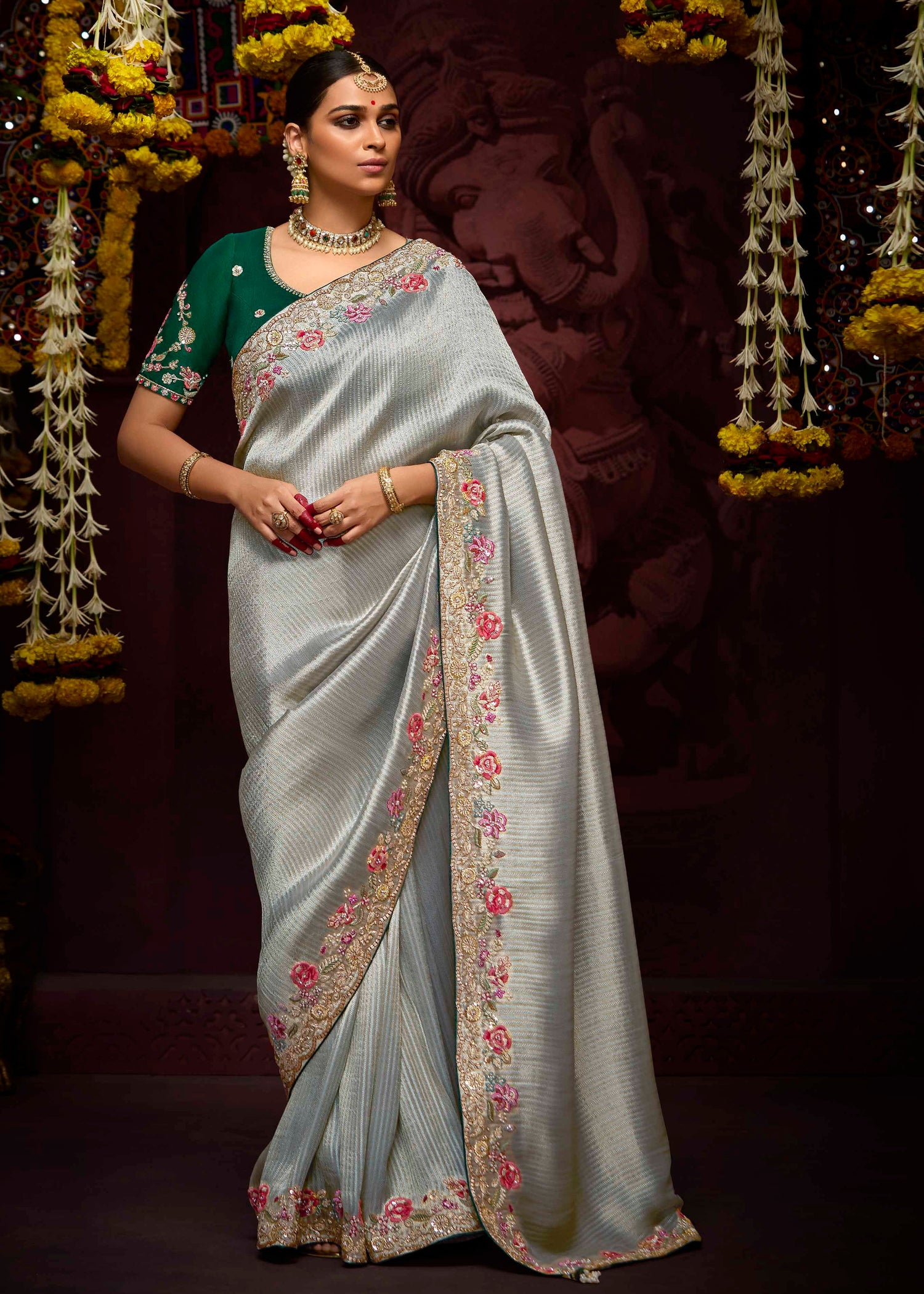 The saree is complemented by a contrast green embroidered blouse that perfectly balances the shimmering silver with a rich, vibrant green tone. The blouse showcases exquisite embroidery, adding an extra layer of grandeur to your bridal look. This combination of silver and green creates a harmonious and striking contrast, ensuring you stand out with grace and beauty.