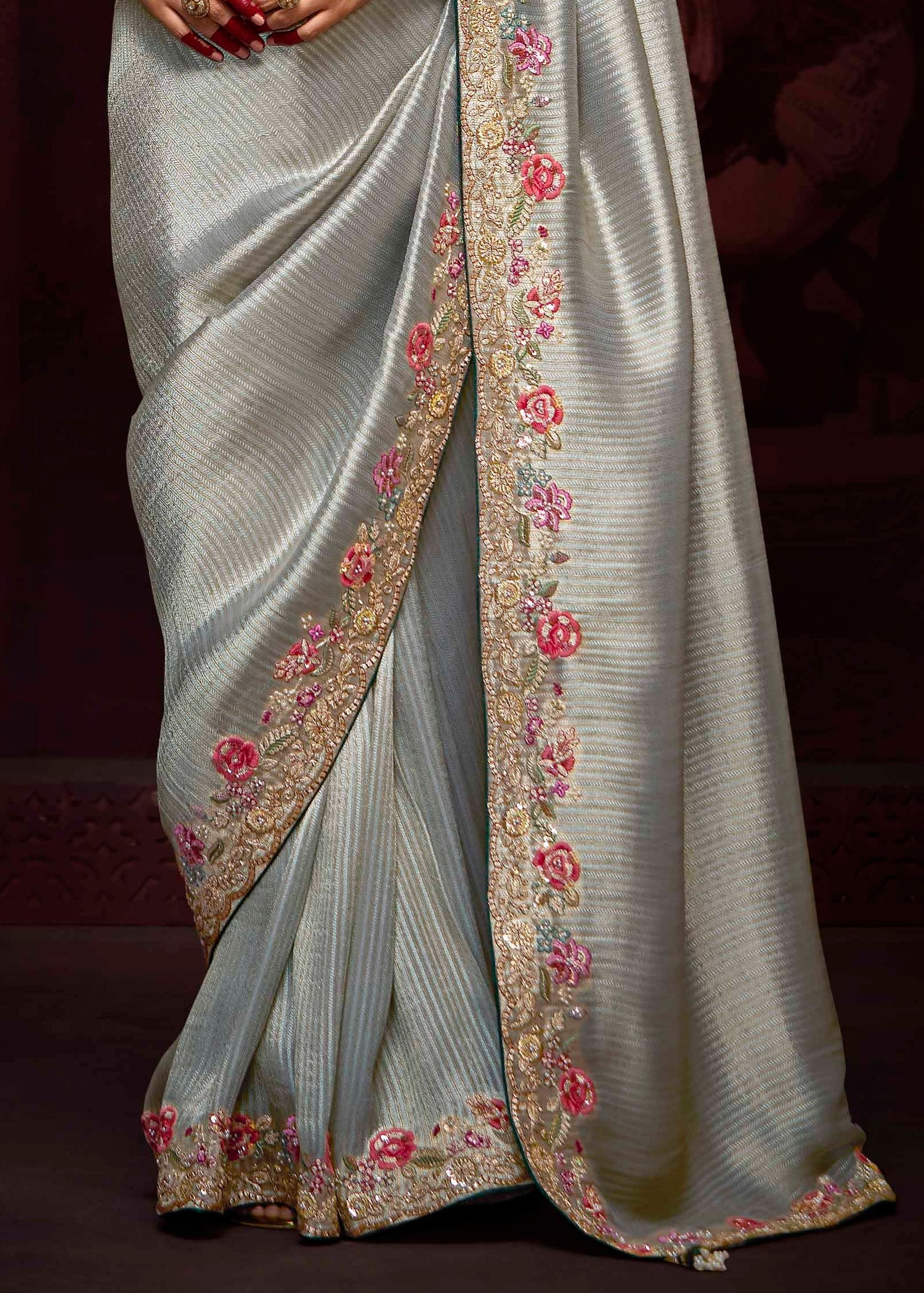 - Embroidery: Hand-embroidered motifs with zari and thread work