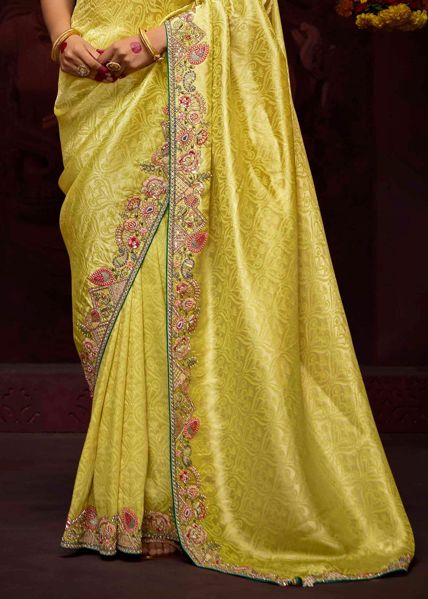 BANARASI SILK YELLOW AND GREEN BRIDAL SAREE WITH HANDWORK EMBROIDERY