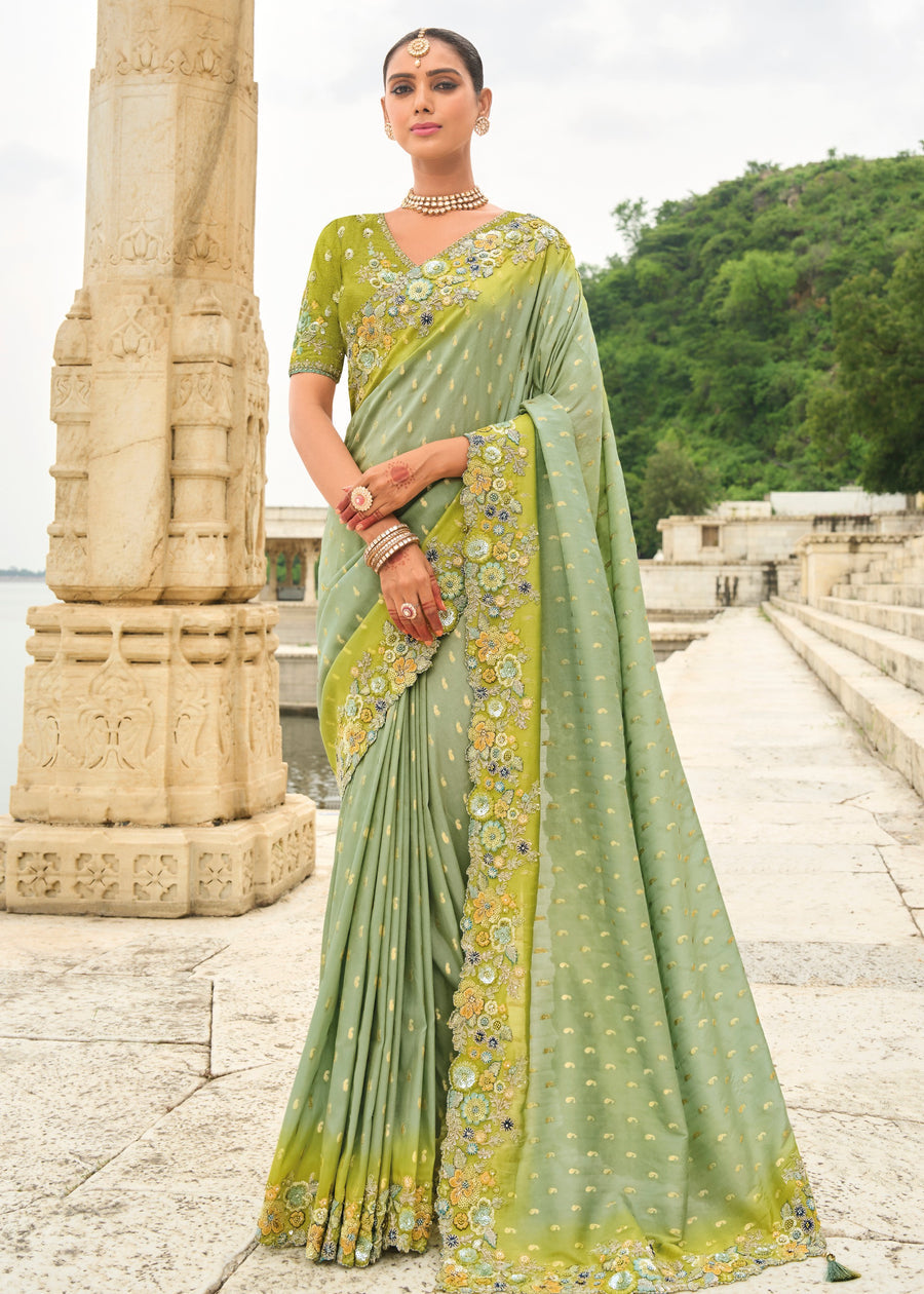 Banarasi Viscose Tissue Silk Pista Green Ombre Handloom Embroidered Saree With Cut Work Border