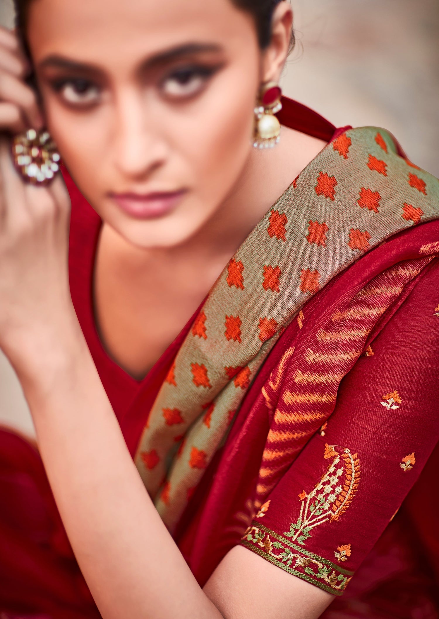Drape this beautiful and comforting brasso silk saree to stand out of the crowd. Its feminine and graceful look makes you feel at your best. It comes in a gorgeous grey colour with a red pallu. The red blouse piece has mesmerizingly beautiful floral designs done with thread embroideries. This saree is an ideal choice for an everyday look as well as for more sophisticated settings.