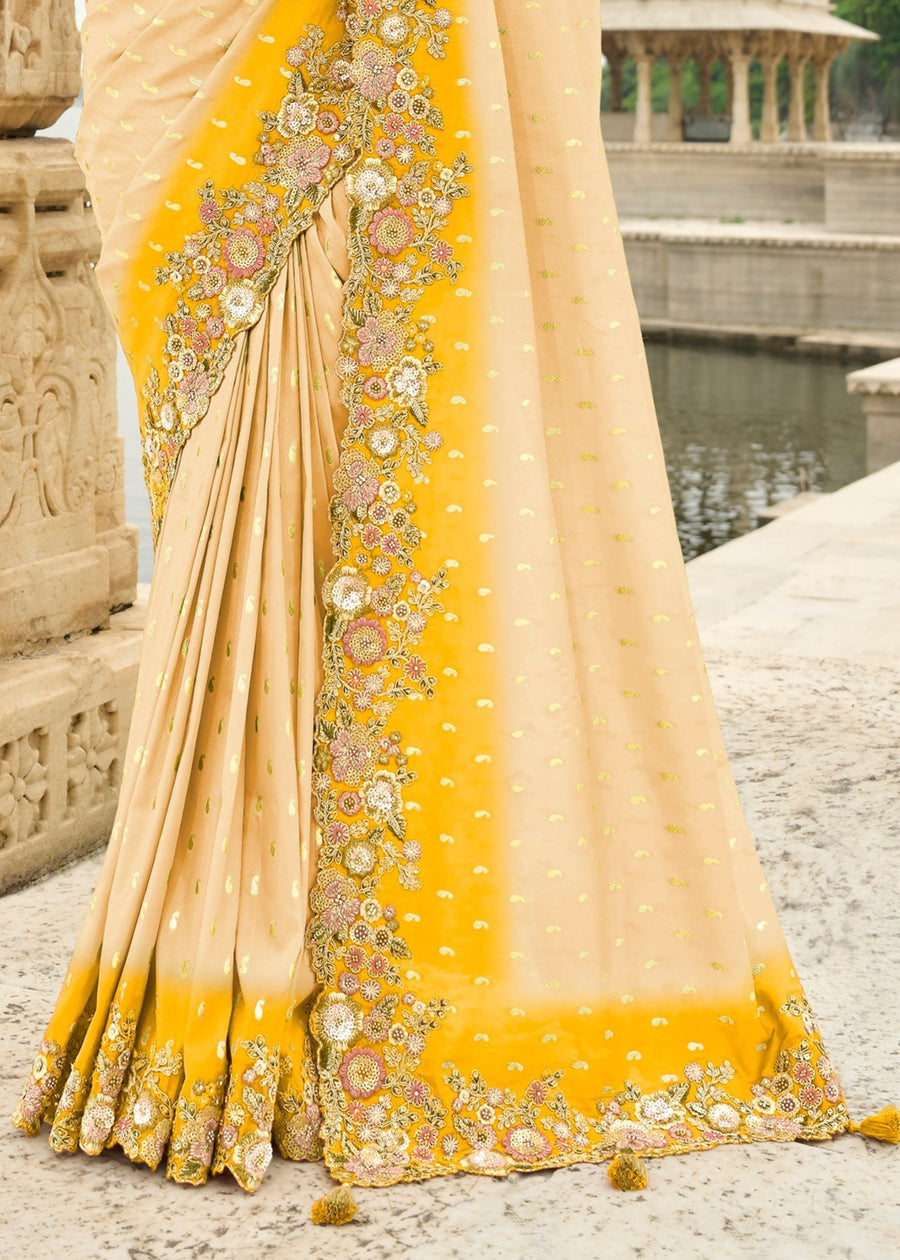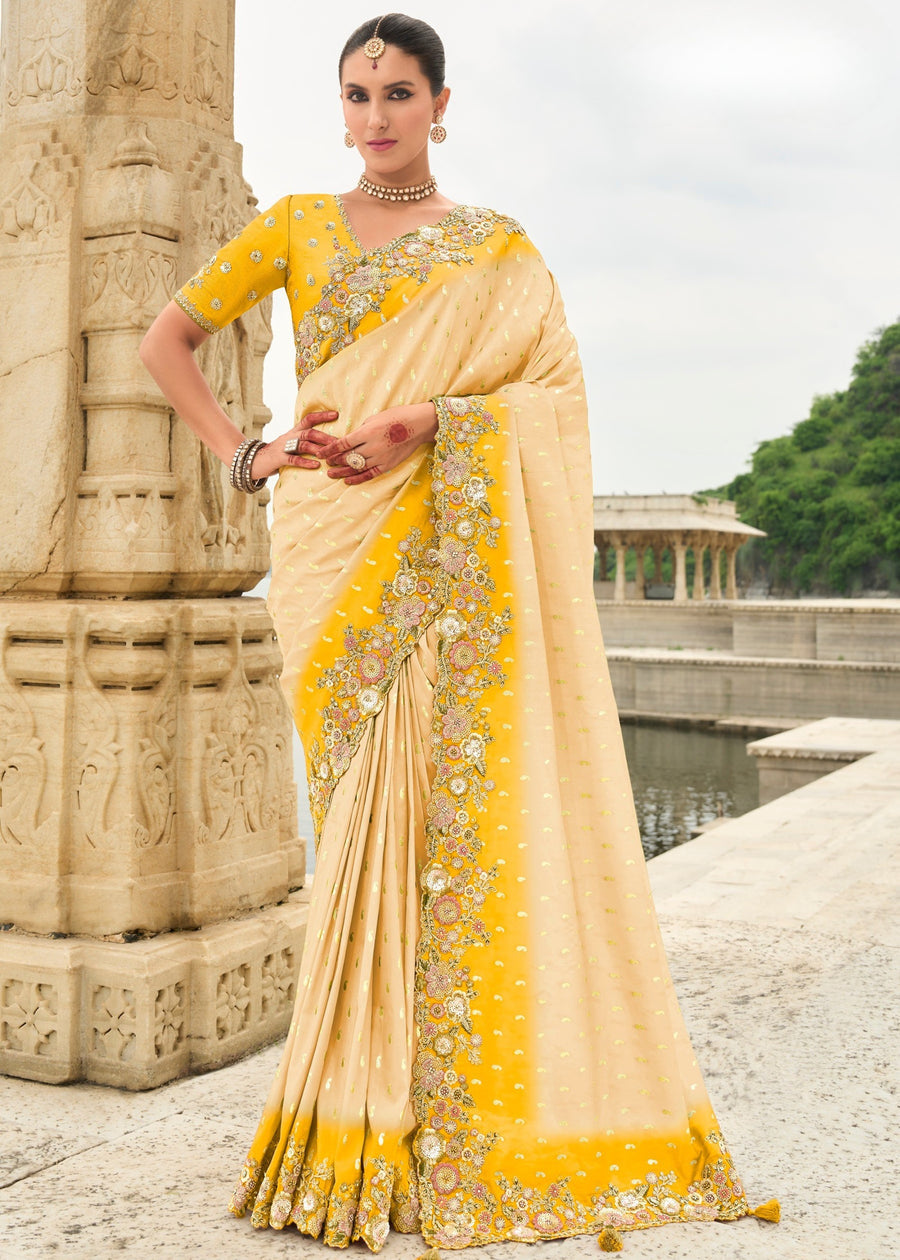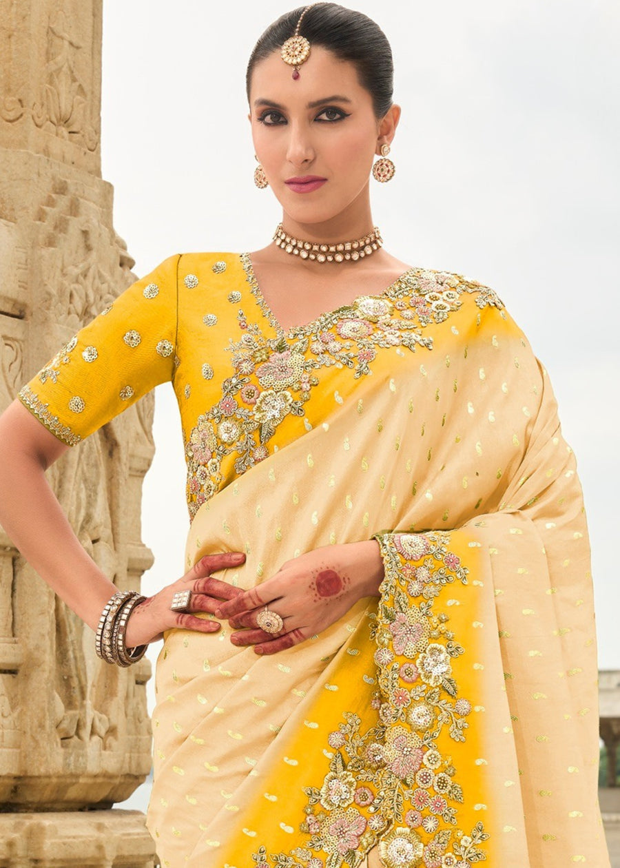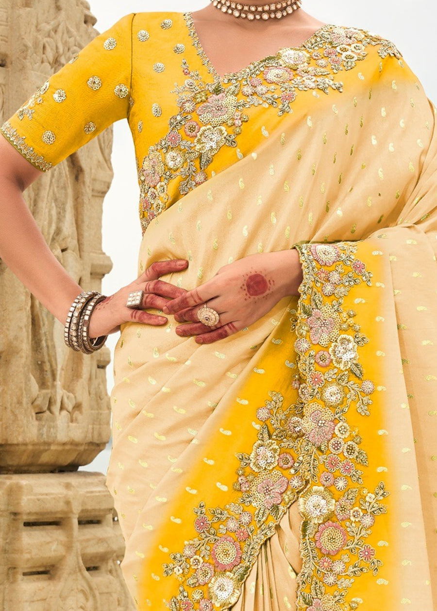 Cream and Yellow Soft Silk Fancy Saree with Embroidery Work