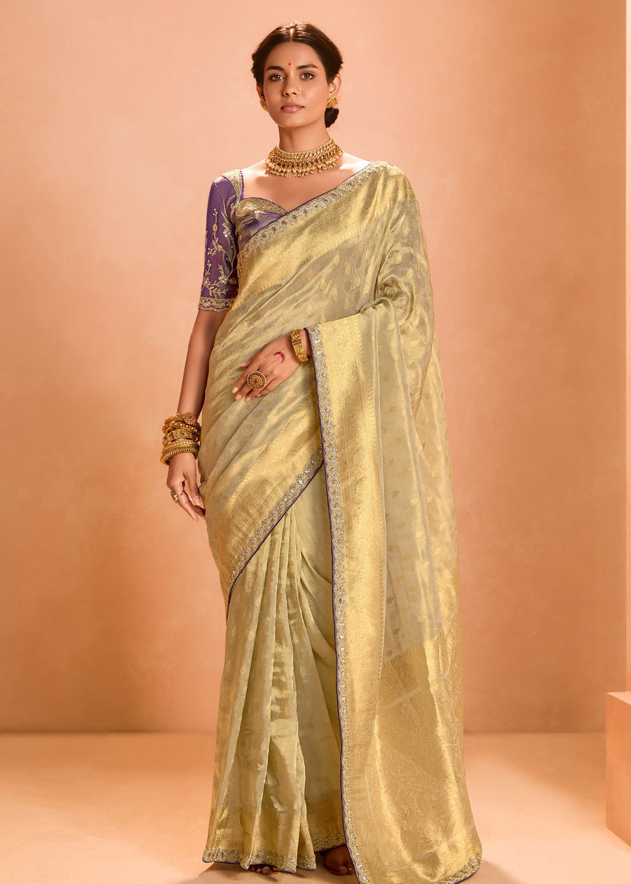 Step into an aura of luxury with this Cream Golden Tissue Silk Handloom Saree, adorned with delicate mint green embroidery and paired with a rich contrast purple blouse. Every inch of this masterpiece reflects meticulous craftsmanship, combining the luminous sheen of tissue silk with the softness and structure of fine handloom weaving.