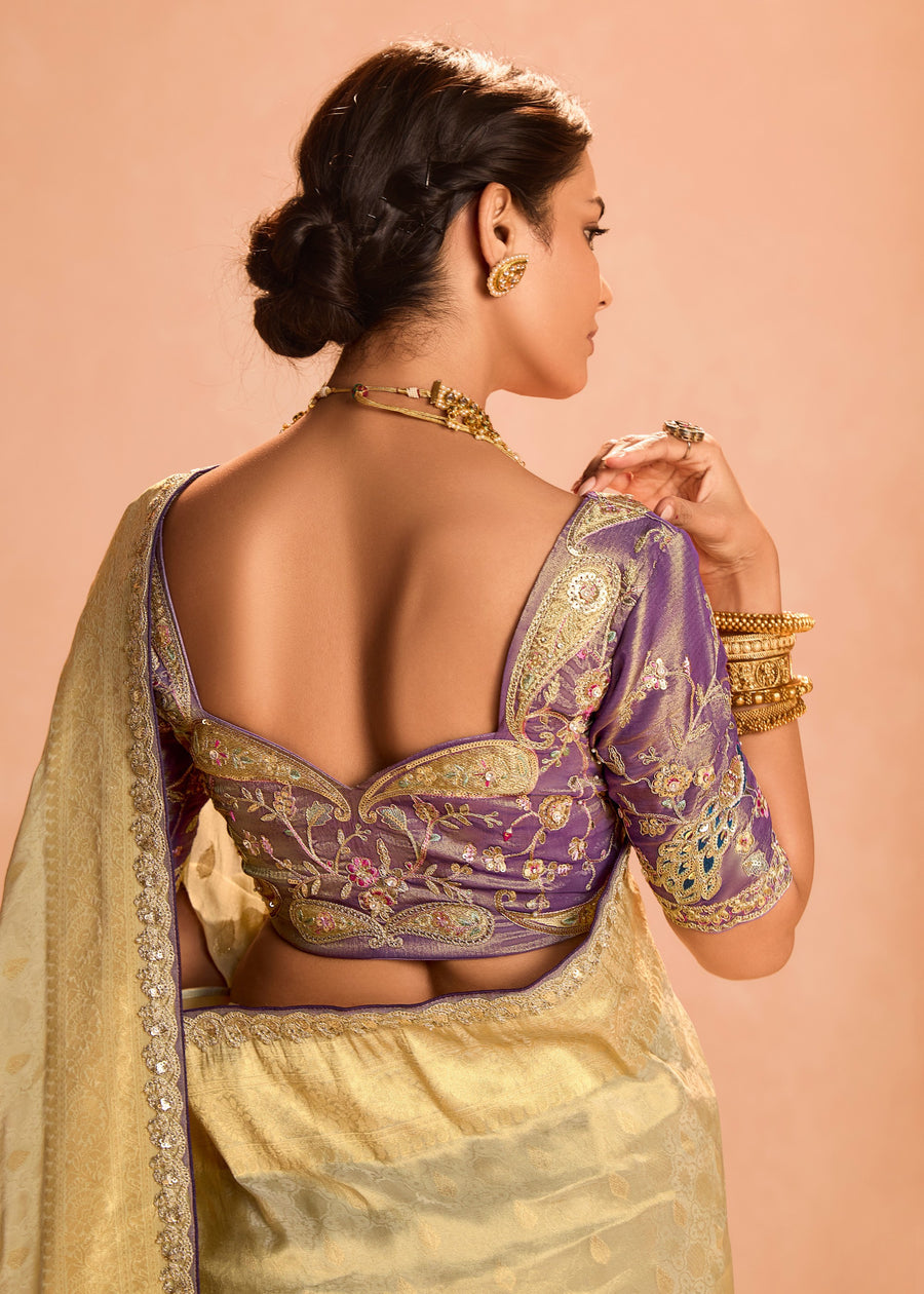 The saree’s base shimmers in a soft cream-gold glow, while intricate mint green threadwork lends it a fresh, contemporary edge. The highlight is its contrast blouse in deep royal purple — a striking color combination that enhances the overall grandeur, making it perfect for weddings, receptions, festive galas, and high-profile celebrations.