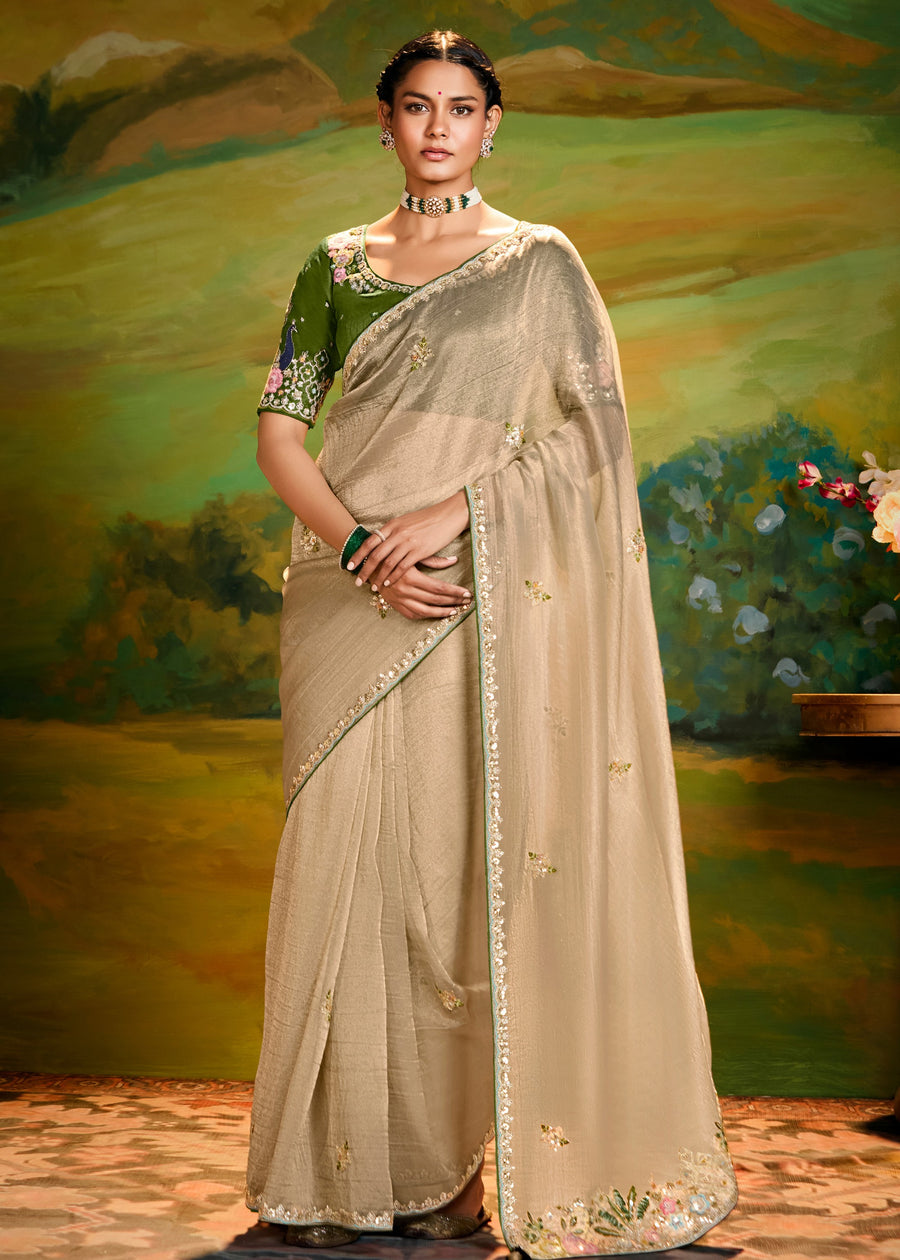 Crushed Satin Tissue Beige Embroidered Saree & Mehendi Green Blouse