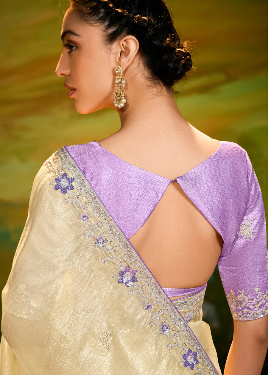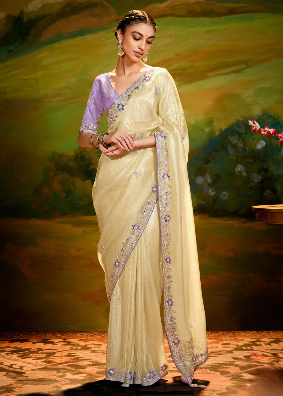 Crushed Satin Tissue Butter Yellow Embroidered Saree & Purple Blouse