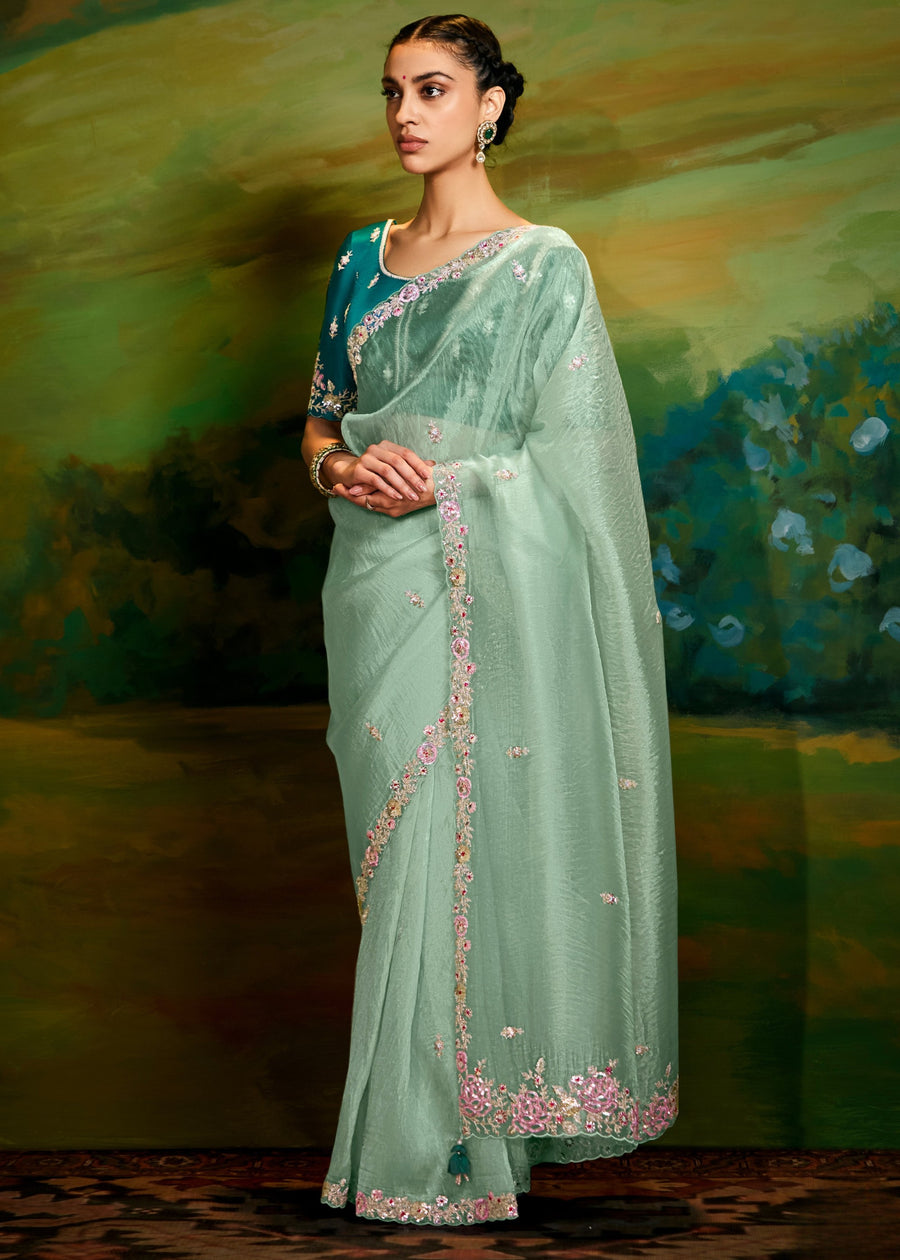 Crushed Satin Tissue Mint Green Embroidered Saree & Contrast Blouse