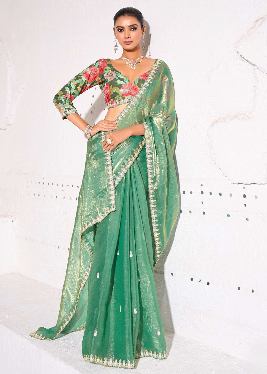 Crushed Tissue Sea Green Embroidered Saree & Printed Blouse