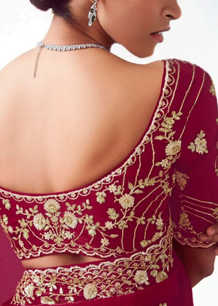 Dark Red Fancy Organza Tissue Silk Embroidered Bridal Saree