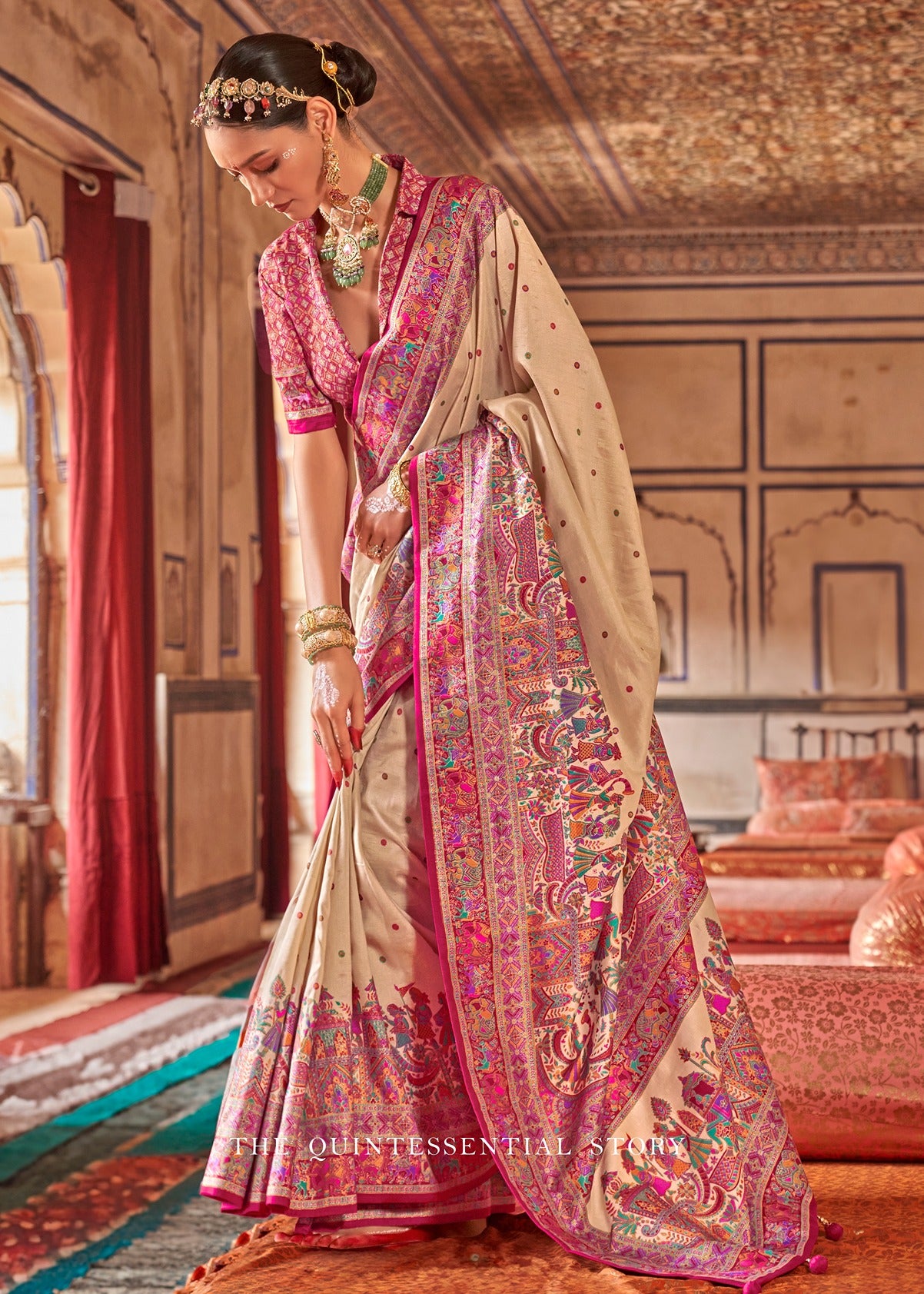 DESIGNER CREAM AND PINK SILK SAREE WITH ETHNIC PRINT