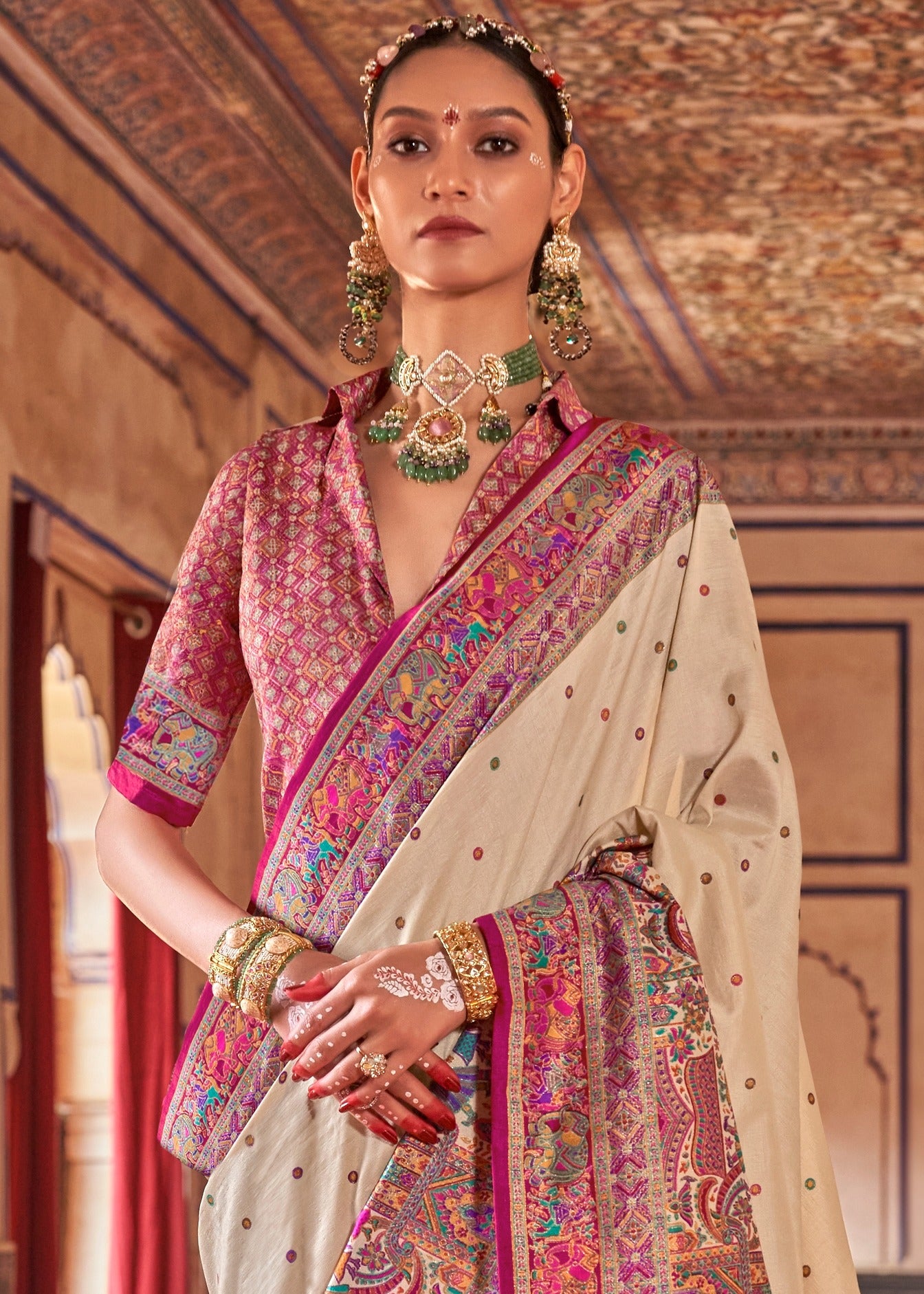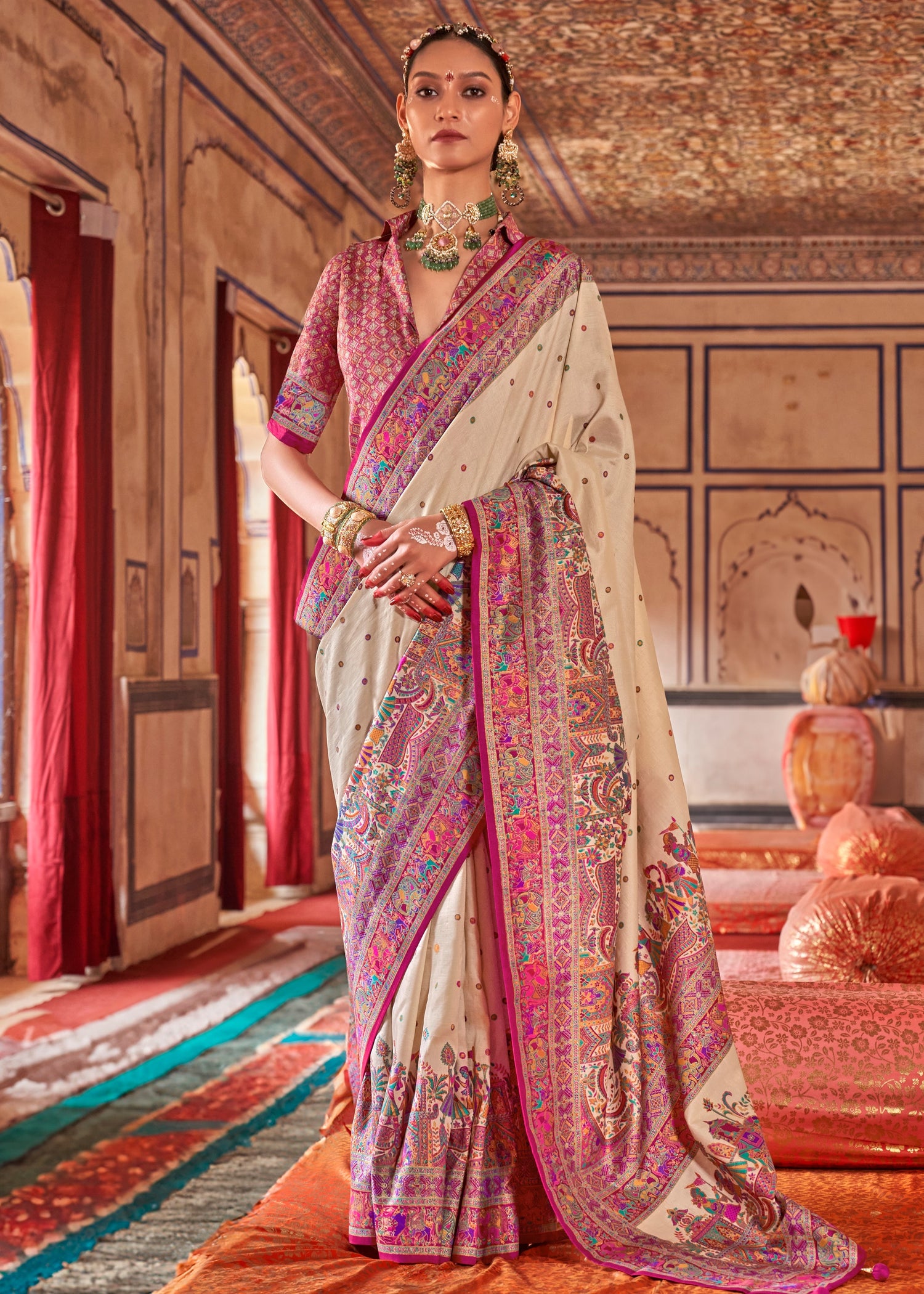 Perfect for wedding wear or festive occasions, family functions, reception or daytime celebrations, this saree offers a lightweight, fluid drape and a luxurious sheen that enhances every movement. Whether you’re styling it for a wedding guest look or a cultural event, this elegant cream and pink saree strikes the perfect balance between elegance and expression.