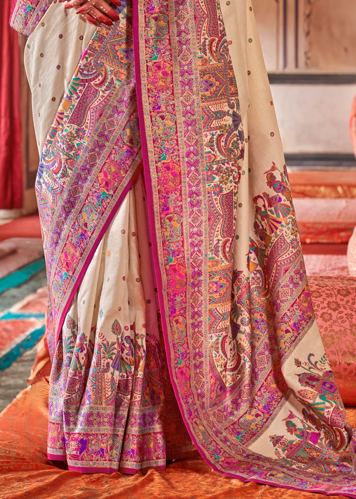 Designer Cream and Pink Silk Saree With Ethnic Print