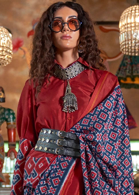 Designer Navy Blue and Red Patola Silk Saree in Modern Look