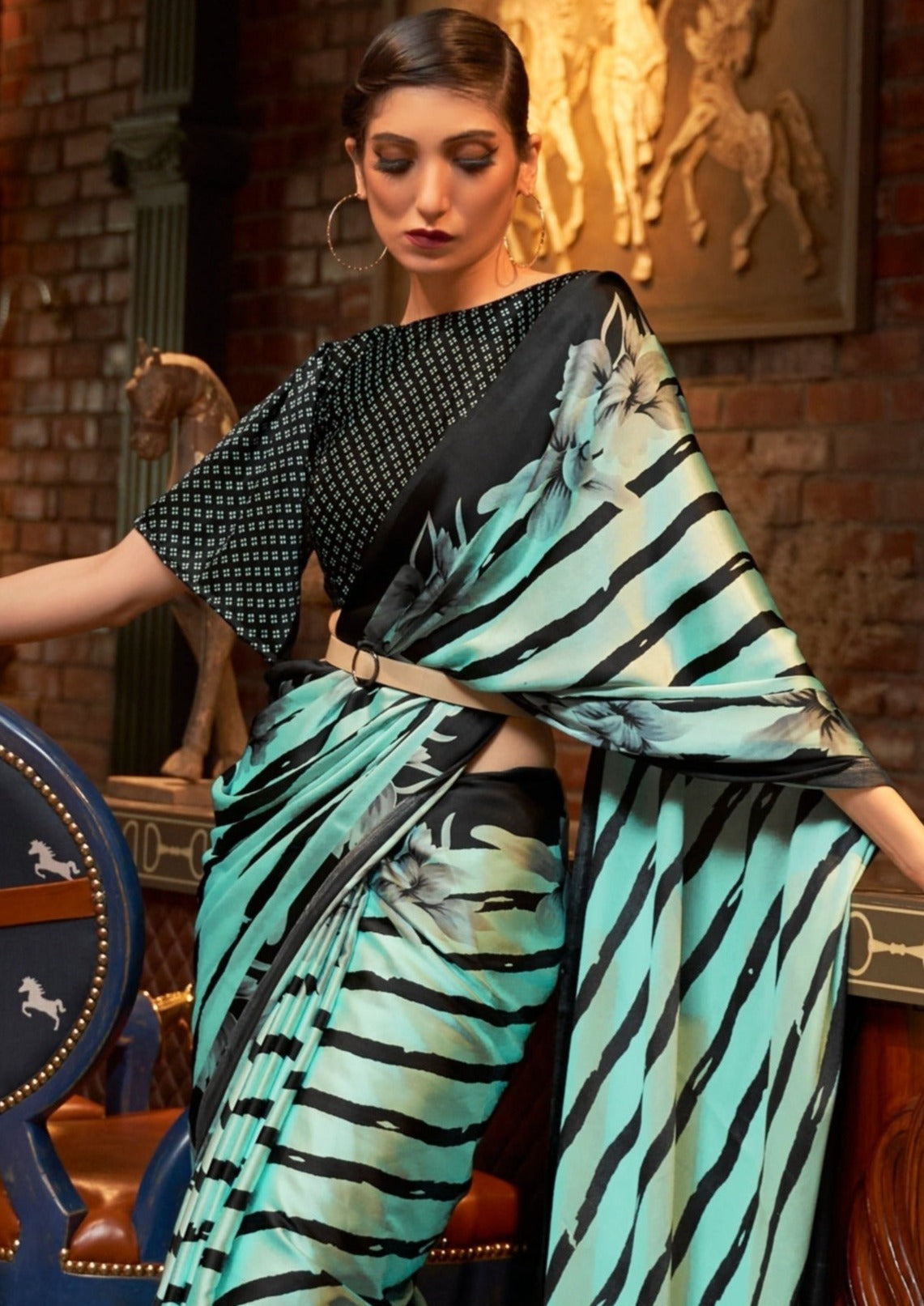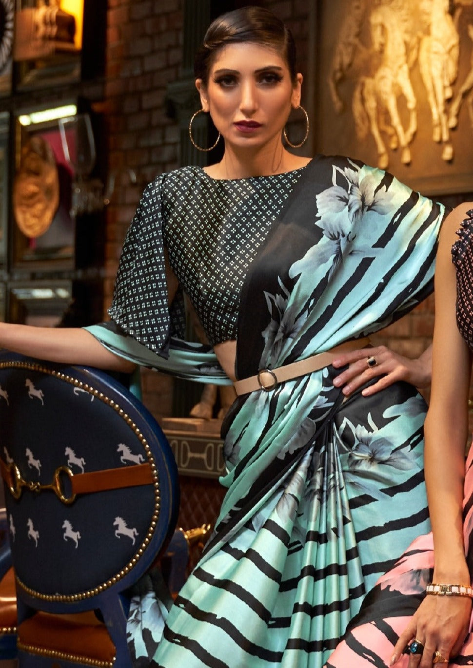 Designed for the modern urban women, this digital print pure satin silk saree is a must have piece for that effortlessly luxe look. This satin silk saree comes in a gorgeous mint green colour with a contrasting black blouse piece. Black floral prints and stripes on a calming mint background elevate the beauty of this saree. The blouse piece has a chic digital print.