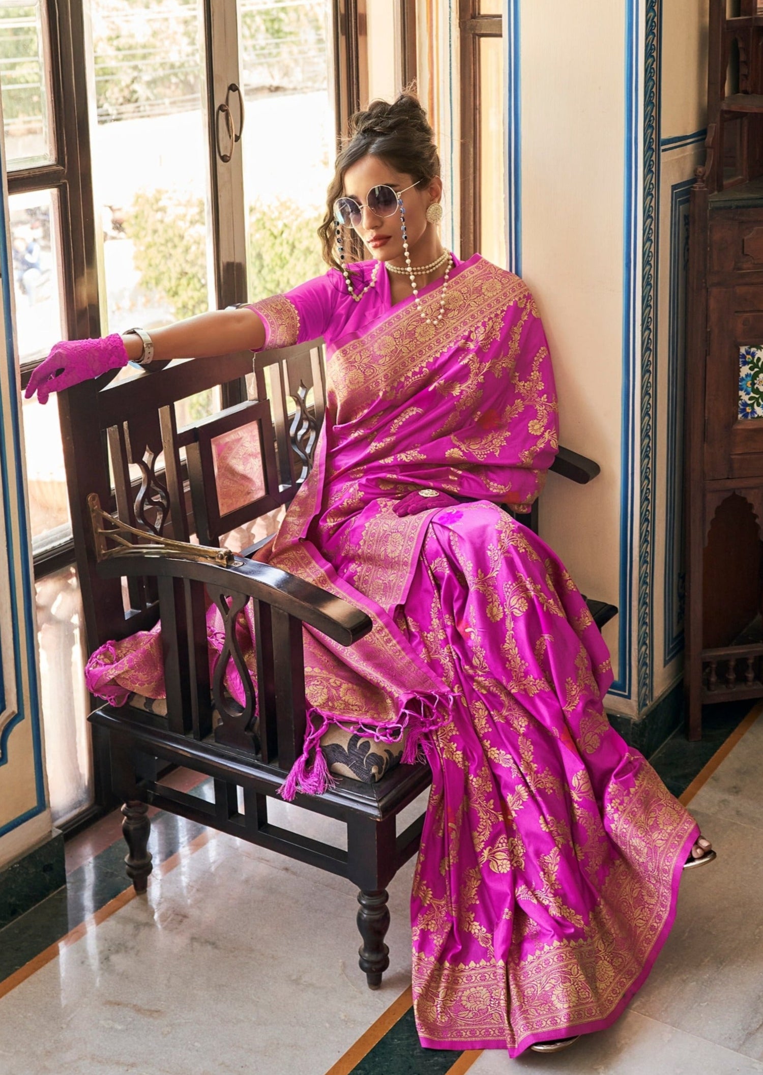 This beautiful handloom beauty is a traditional zari silk saree, having gorgeous gold zari woven details on it. This gorgeous pink silk saree carries a sense of sophistication and elegance which are the beautifully achieved by our highly skilled weavers. Months of karigari and skilfulness has resulted in this beautiful saree. The pallu illustrates beautiful Mughal Bootas and the pleats have gorgeous zari bels and woven colourful floral designs. This royal saree is an epitome of grace and divine beauty.