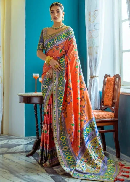 Fusion Banarasi Patola Silk Orange Saree with Paithani Pallu