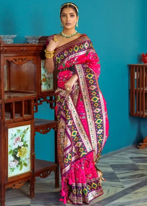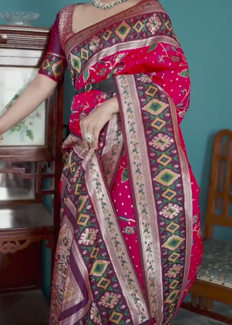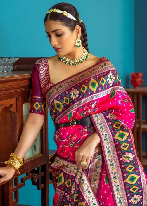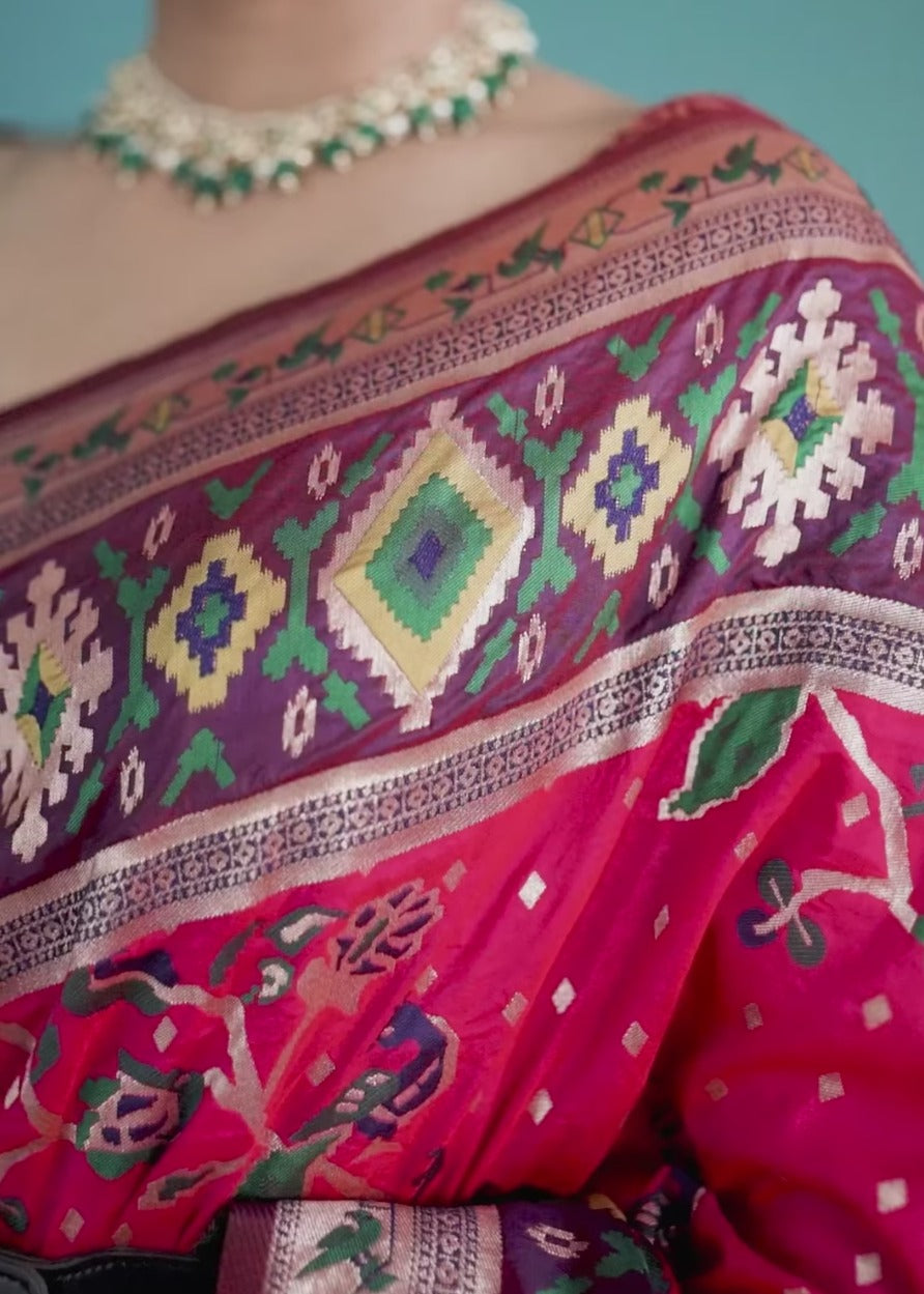 Shop Now to own this Fusion Banarasi Patola Silk Pinkish Red Saree with Paithani Pallu, and bring home a piece of timeless Indian craftsmanship!