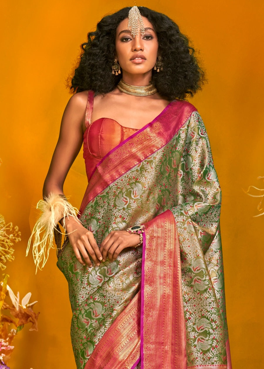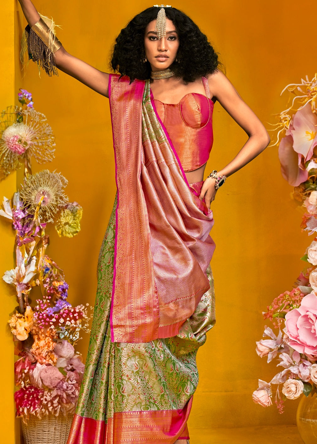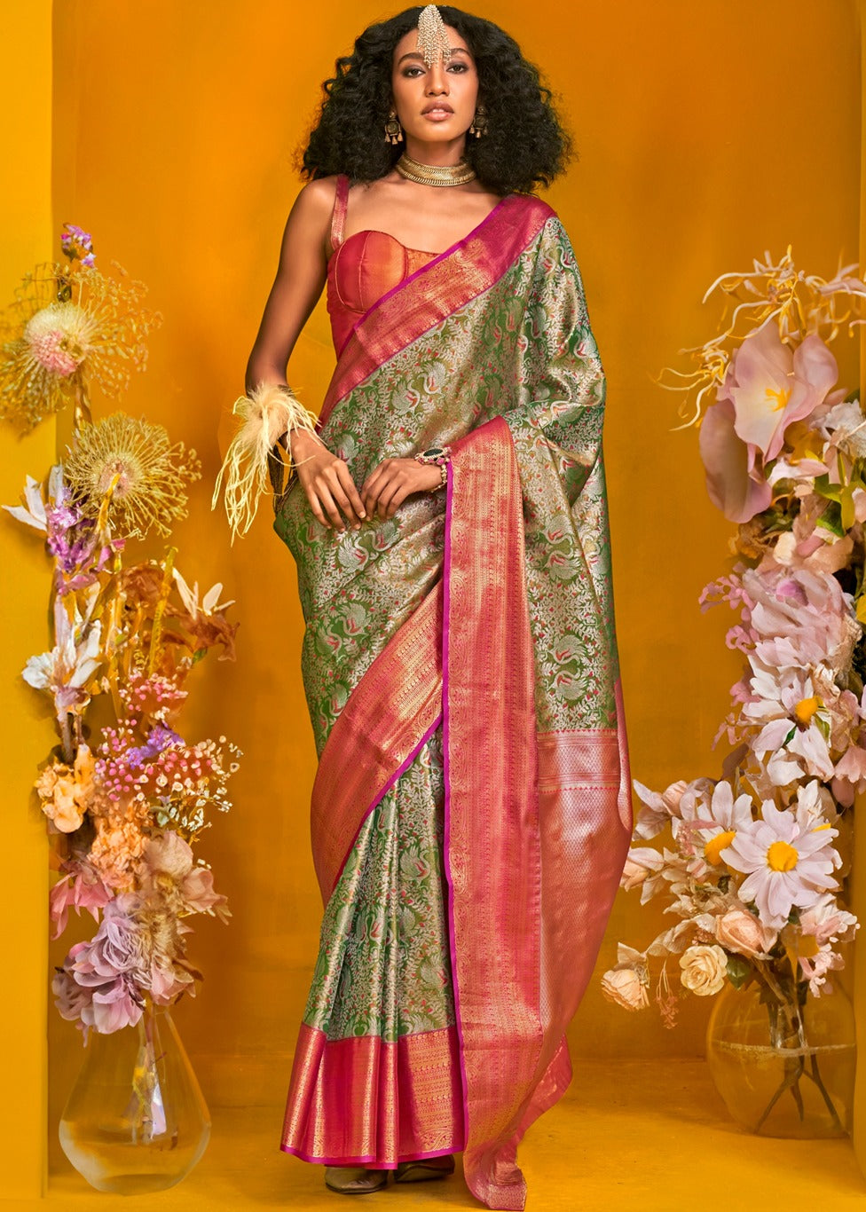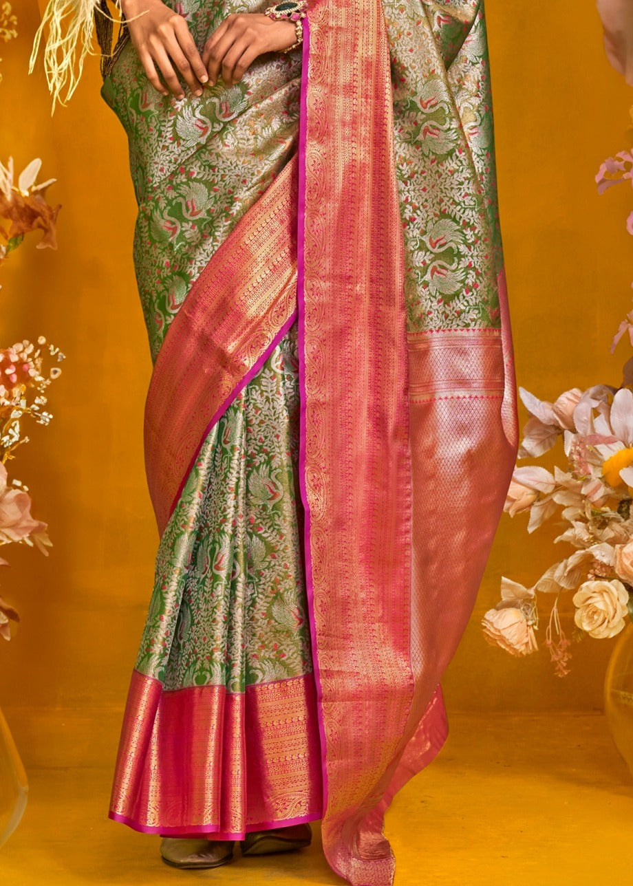 Green and Pinkish Red Kanjivaram Silk Handloom Saree