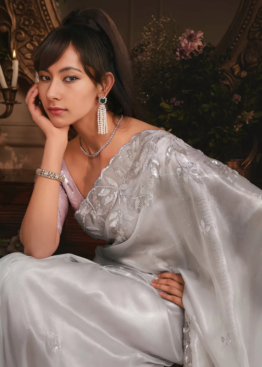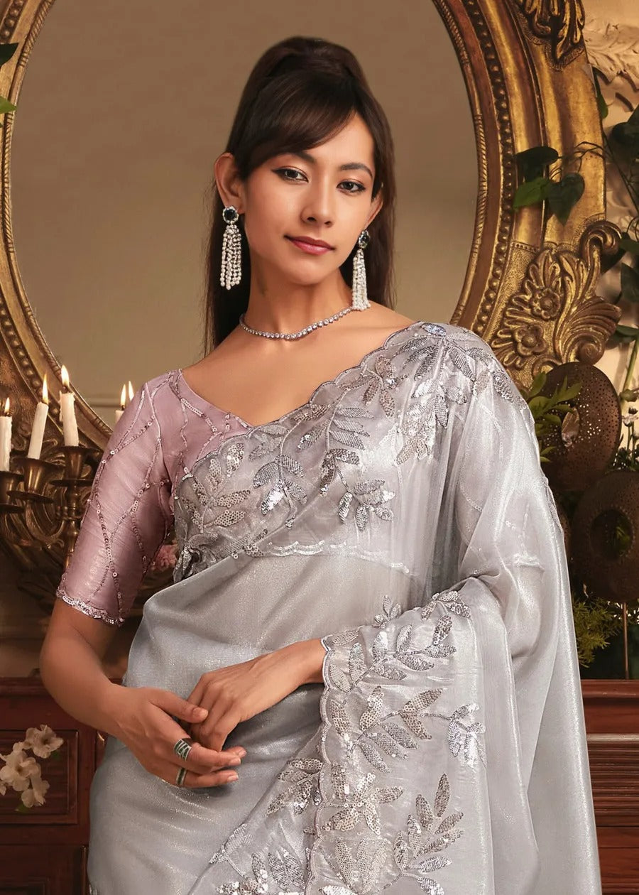 Grey Organza Tissue Silk Saree & Pastel Pink Blouse With Sequins Embroidery