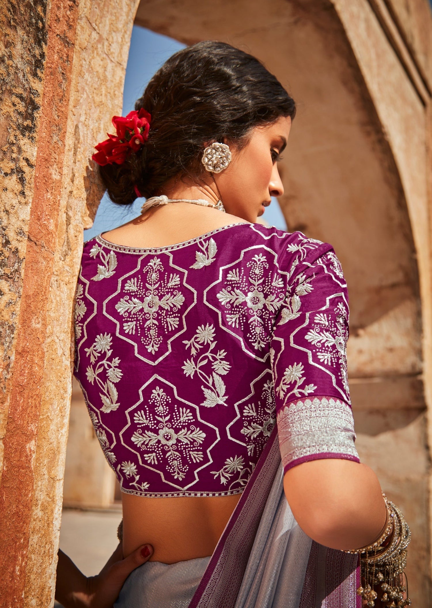 One of a kind saree from exclusive collections of our luxe edit, this partywear grey toned organza saree is a head turner. It comes with a contrasting maroon blouse piece with heavy threadwork embroidery. This saree has zari borders and pallu beautifully woven with silver threads. This saree makes for an elegant traditional attire.