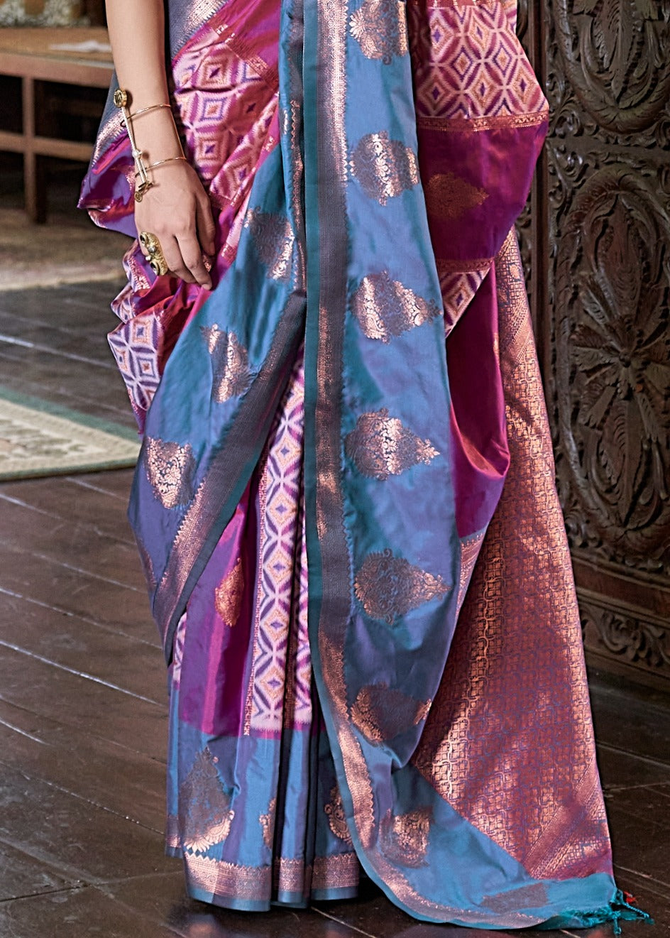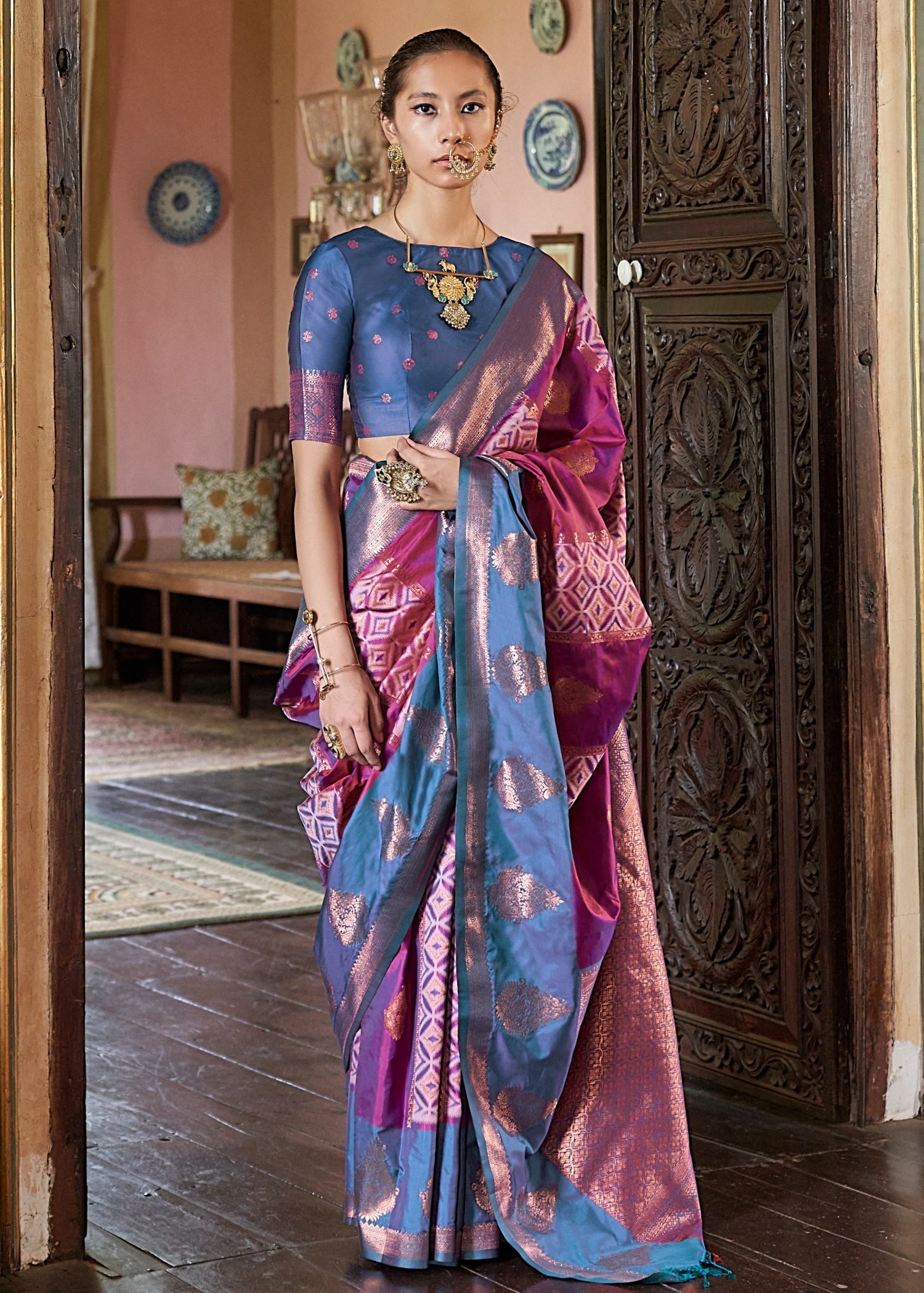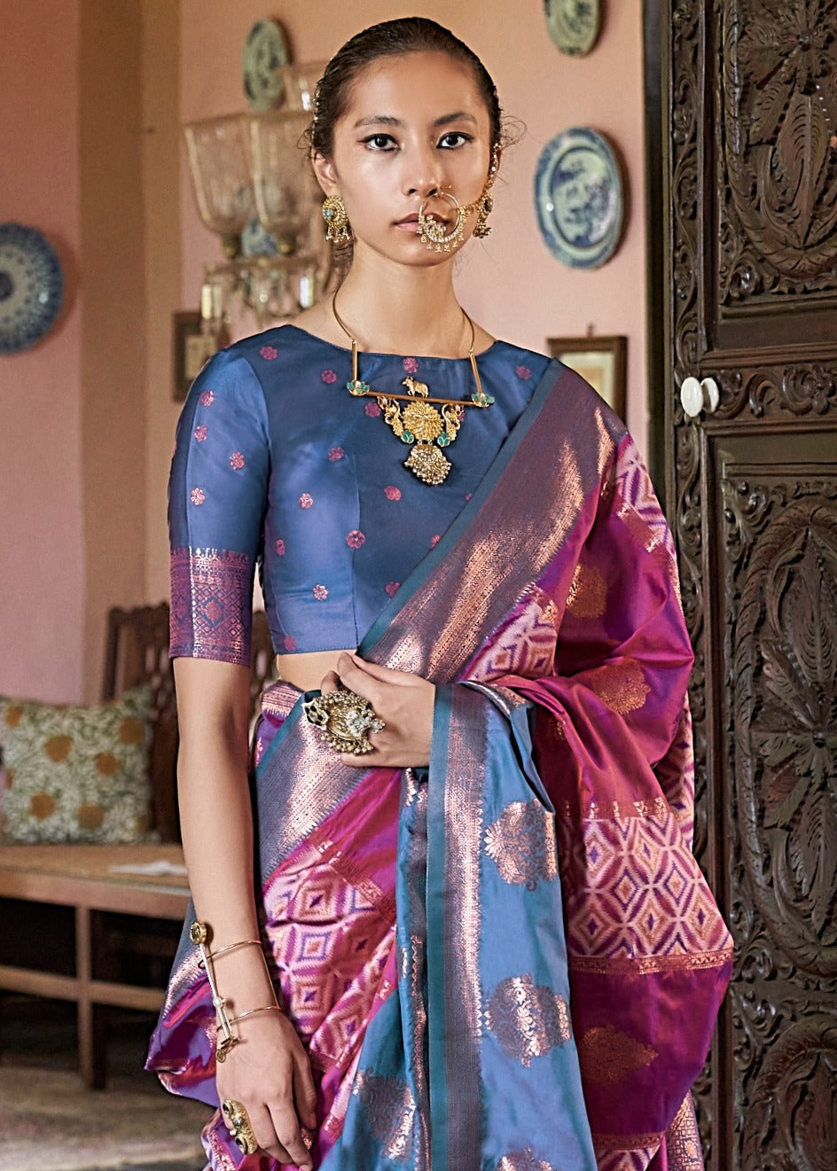 Hot Pink & Blue Kanjivaram Silk Zari Weaving Saree