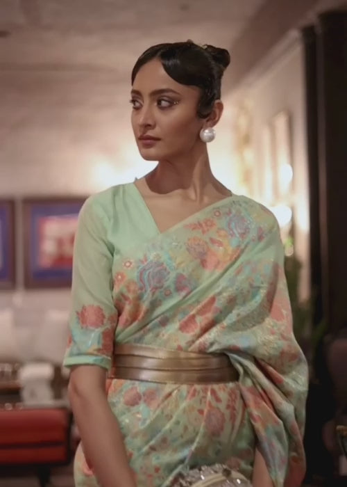 Styling tip: Carry this elegant handloom kashmiri silk saree with a classy clutch and a pair of chic heels. Add some gold finish statement jewelry, like a choker necklace; and go for bold mascara and glossy lips.