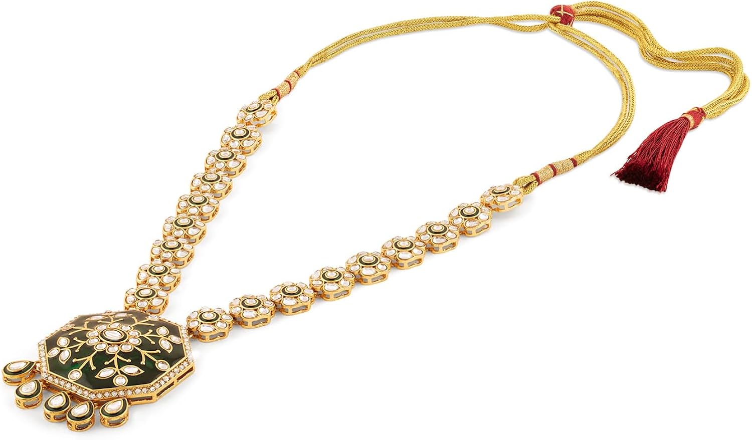 Indulge in regal artistry with the Kundan Bridal Jewellery Long Necklace Set With Earrings & Maang Tikka, an exquisite creation inspired by royal heirlooms. Each element of this handcrafted set reflects the opulence of traditional Indian jewellery, blending Kundan setting with intricate meenakari detailing and fine inlay work.
