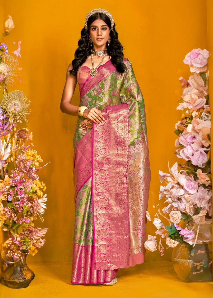 Lawn Green and Pink Kanjivaram Silk Handloom Saree