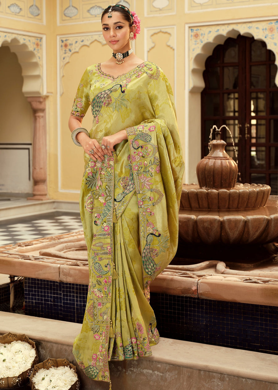 Lime Green Soft Banarasi Silk Embroidered Saree