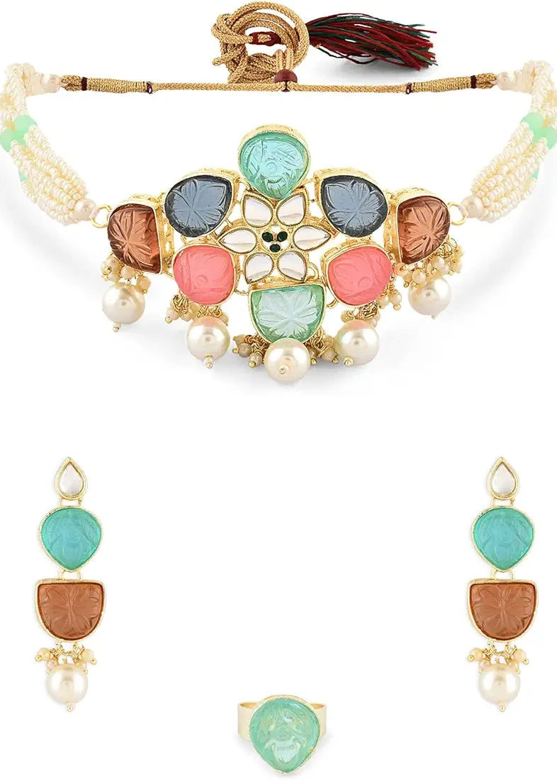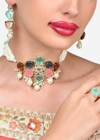 Elevate your elegance with our Artificial Pearls Necklace Set With Earrings & Adjustable Ring. This designer multicolor necklace set features intricate floral patterns crafted meticulously along with pearls, offering a radiant and timeless charm. The necklace is adorned with vibrant multicolor design, complemented by delicate gold-plated design that adds a touch of feminine grace. Paired with matching earrings & adjustable ring, this set is perfect for weddings, festive occasions. Add a splash of color and grace to your jewellery collection with this exquisite set.