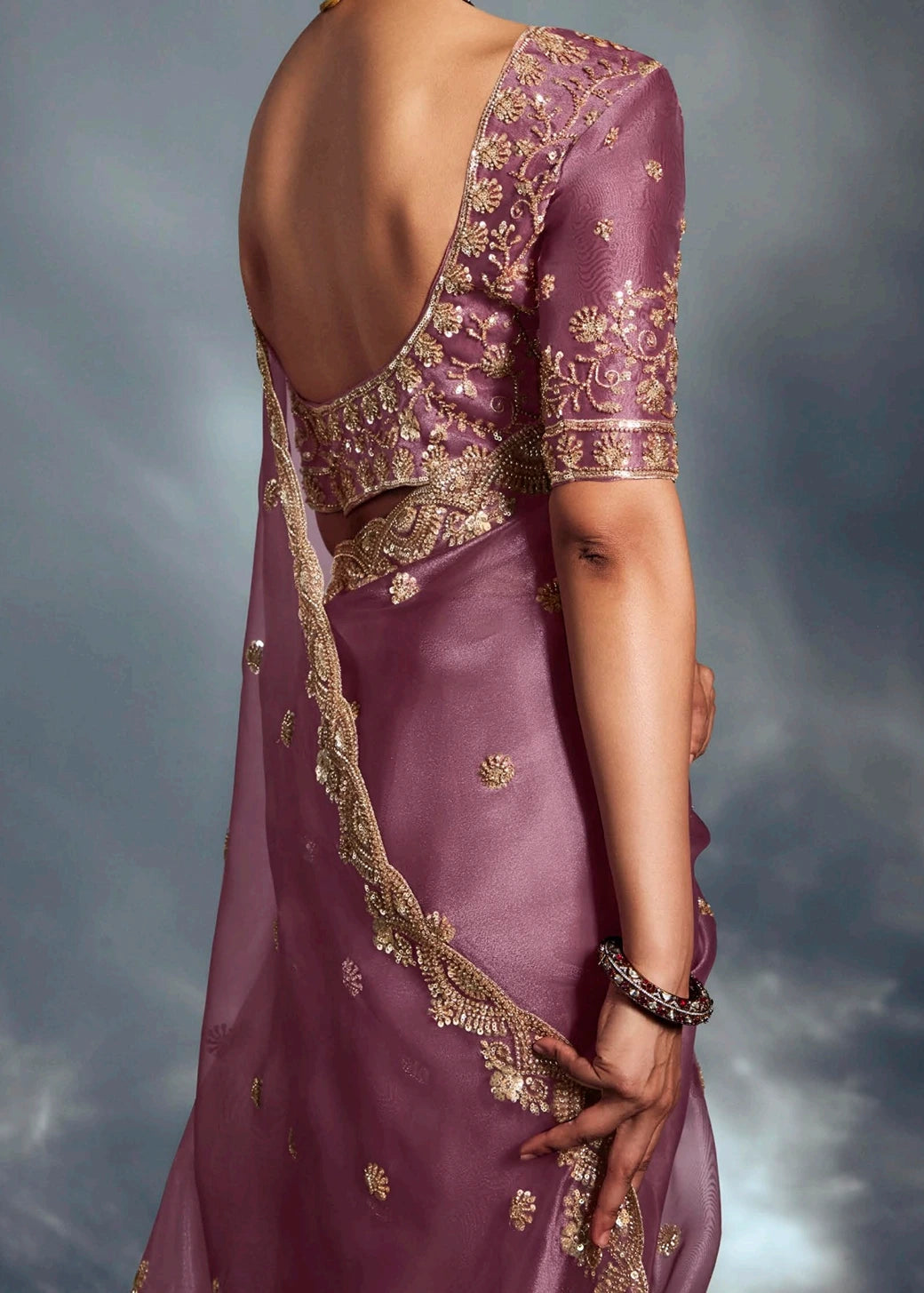 Onion Pink Organza Tissue Silk Hand Embroidered Saree