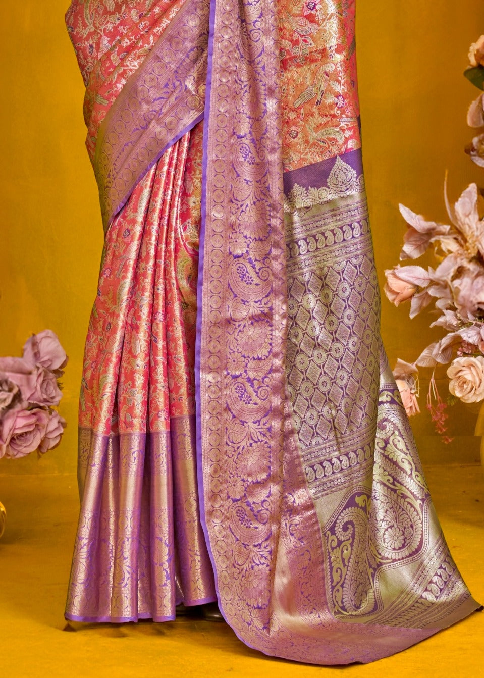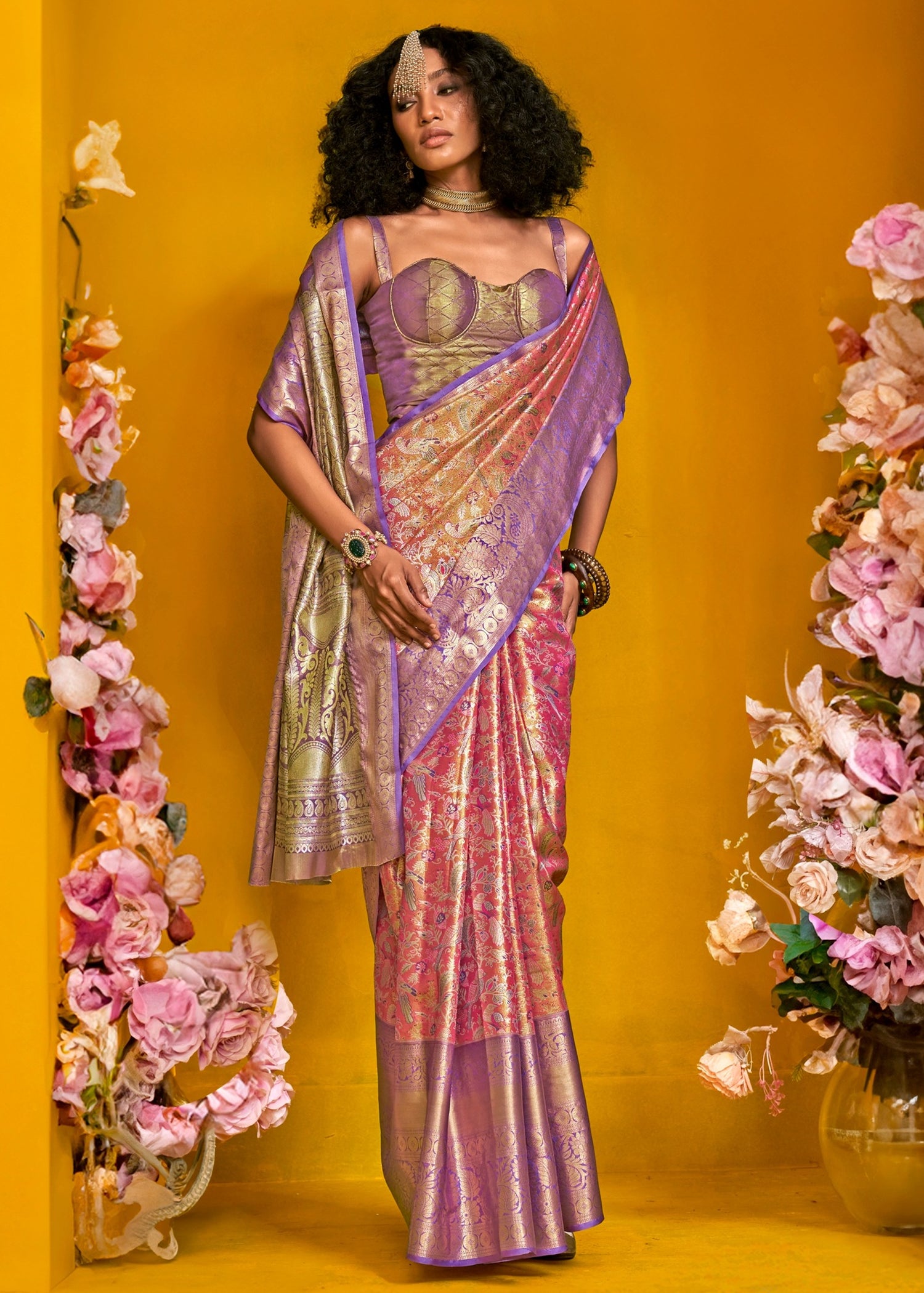 - Blouse: Purple, designed to complement the saree’s richness