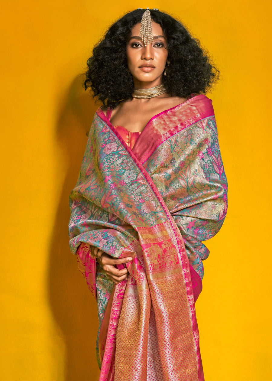 Make a bold fashion statement and embrace the grace of tradition with this Pastel Blue and Hot Pink Kanjivaram Silk Handloom Saree—a masterpiece that exudes opulence and charm. Perfect for those who love to stand out with elegance. A beauty in Kanjivaram silk, this saree combines exclusive traditional design with a modern touch, perfect for women seeking elegance and sophistication.