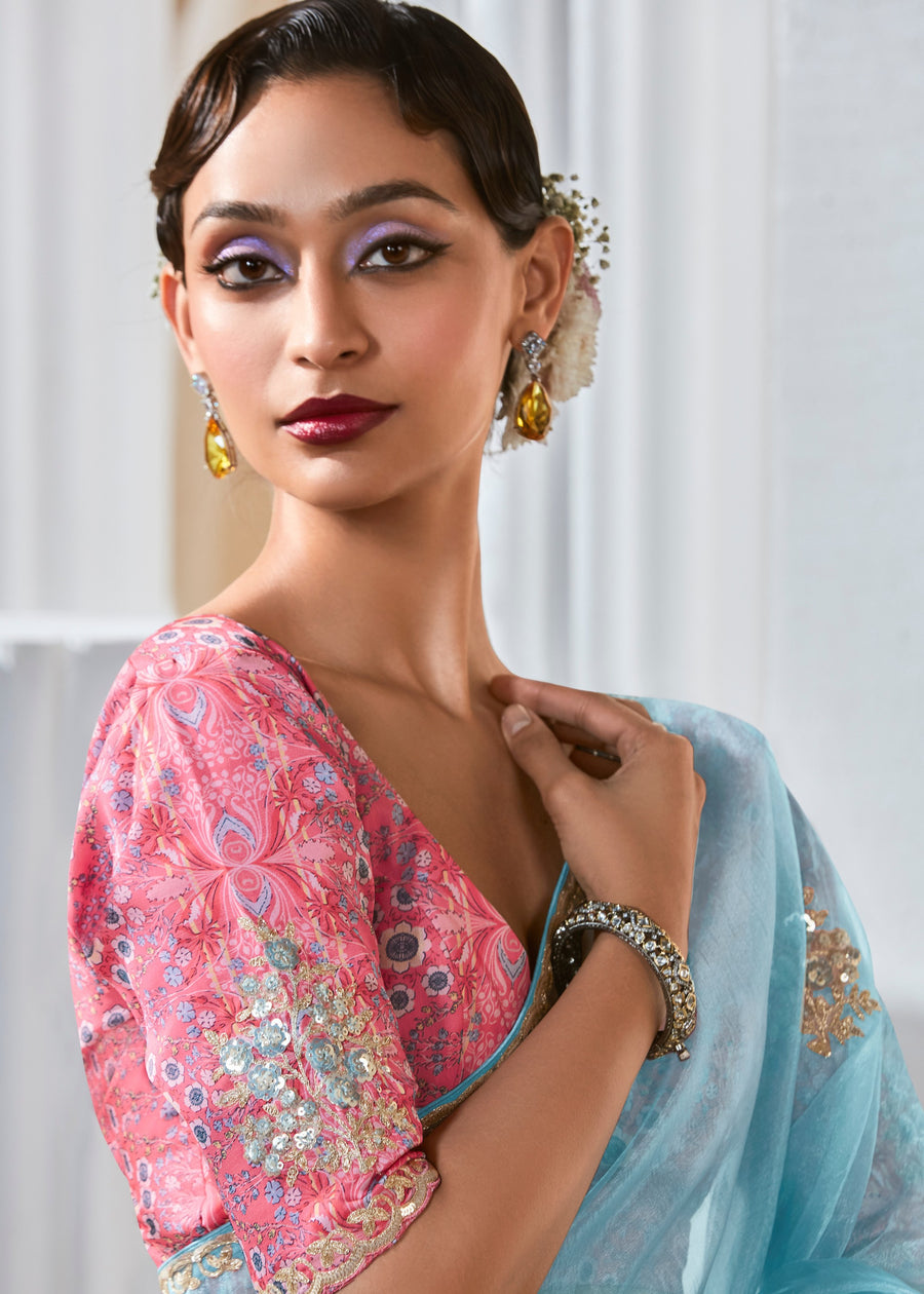 Pastel Blue Organza Tissue Silk Embroidered Saree & Pink Printed Blouse