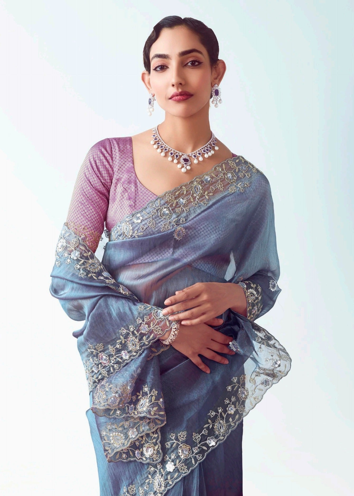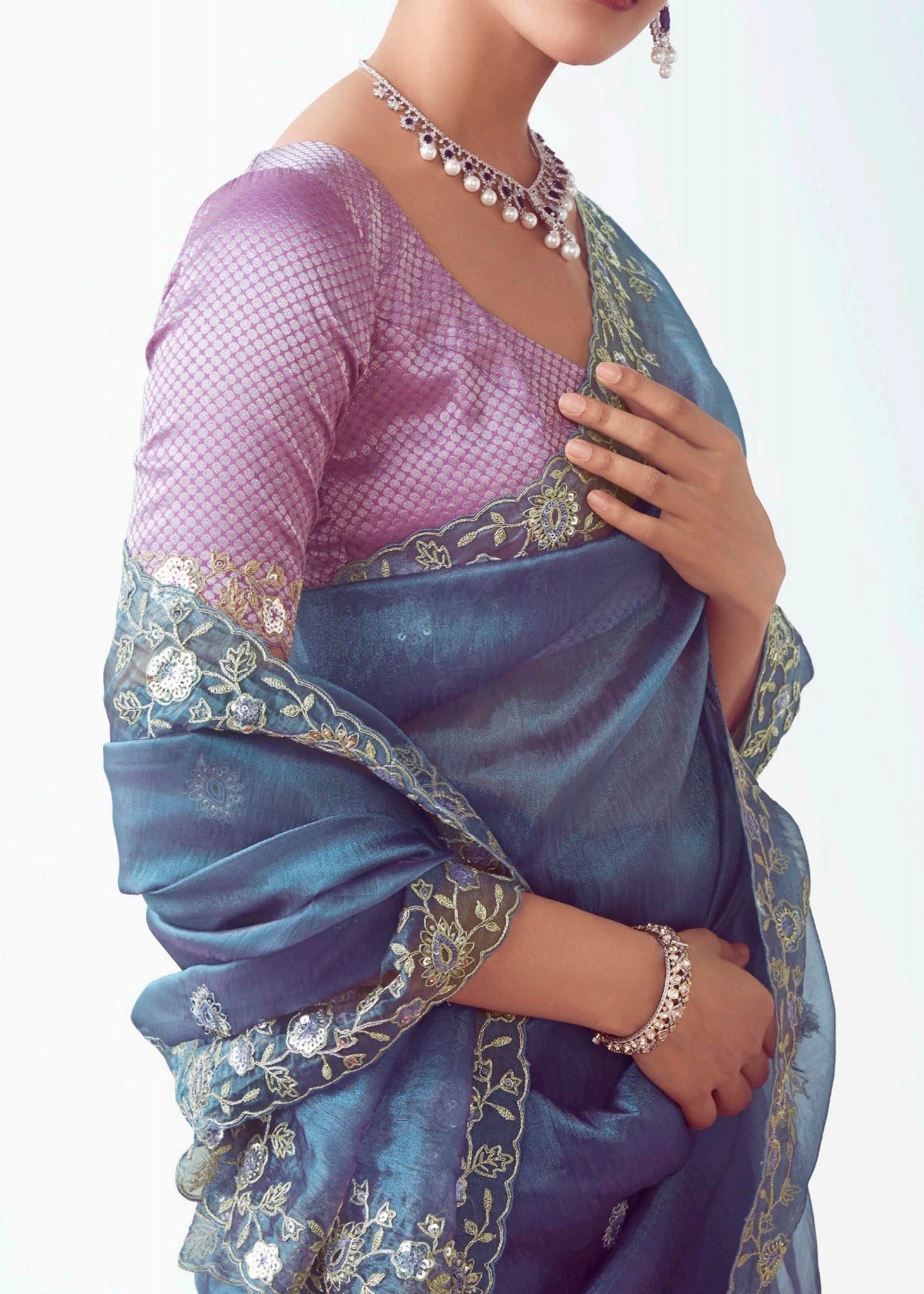 Pastel Blue Organza Tissue Silk Embroidered Saree with Pink Banarasi Blouse