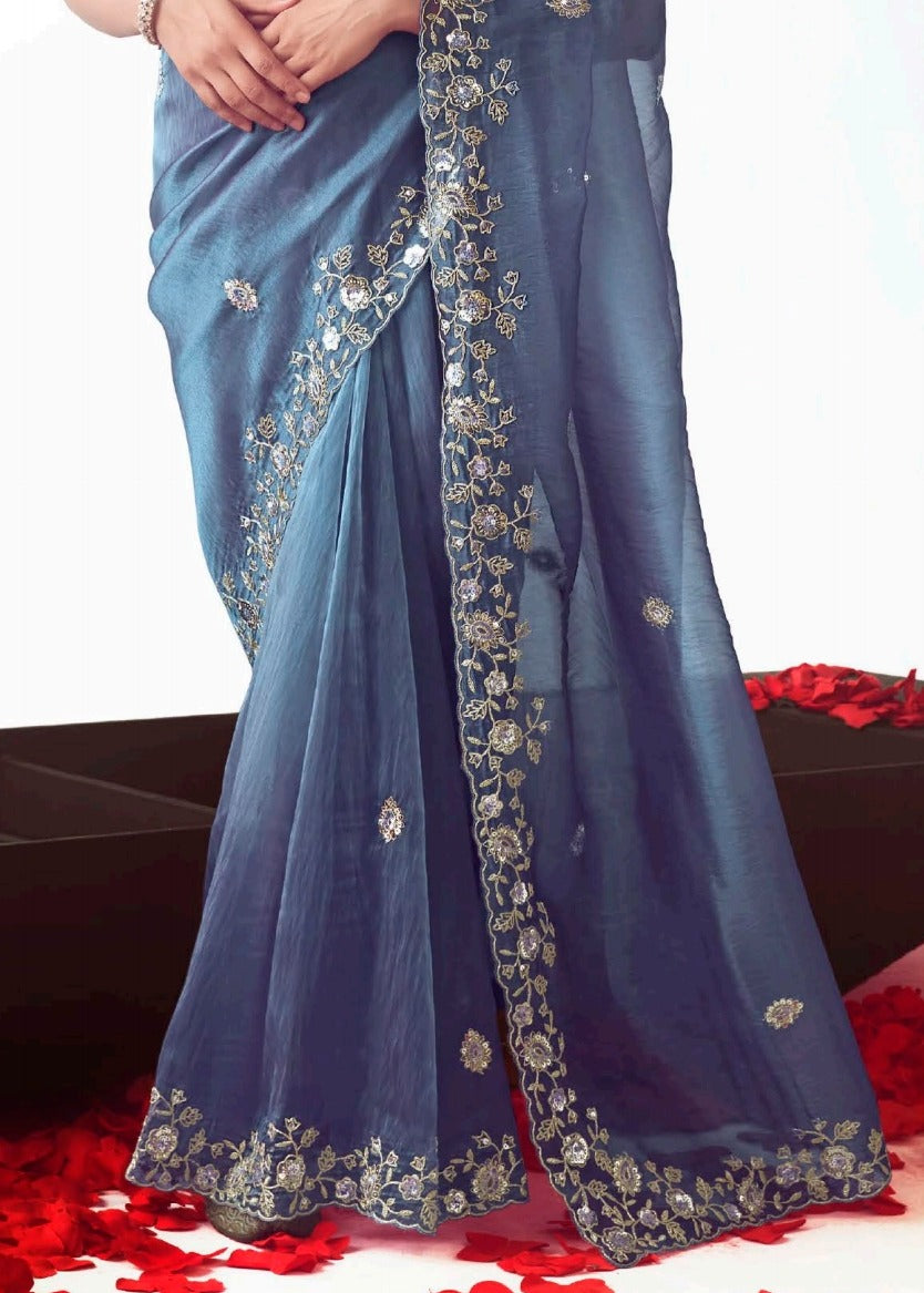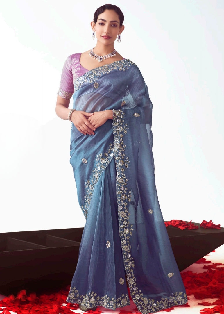 PASTEL BLUE FANCY EMBROIDERED SAREE ONLINE FOR WEDDING