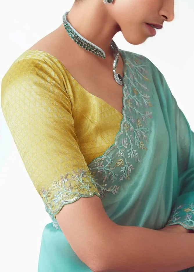 Pastel Blue Organza Tissue Silk Embroidered Saree with Yellow Banarasi Blouse