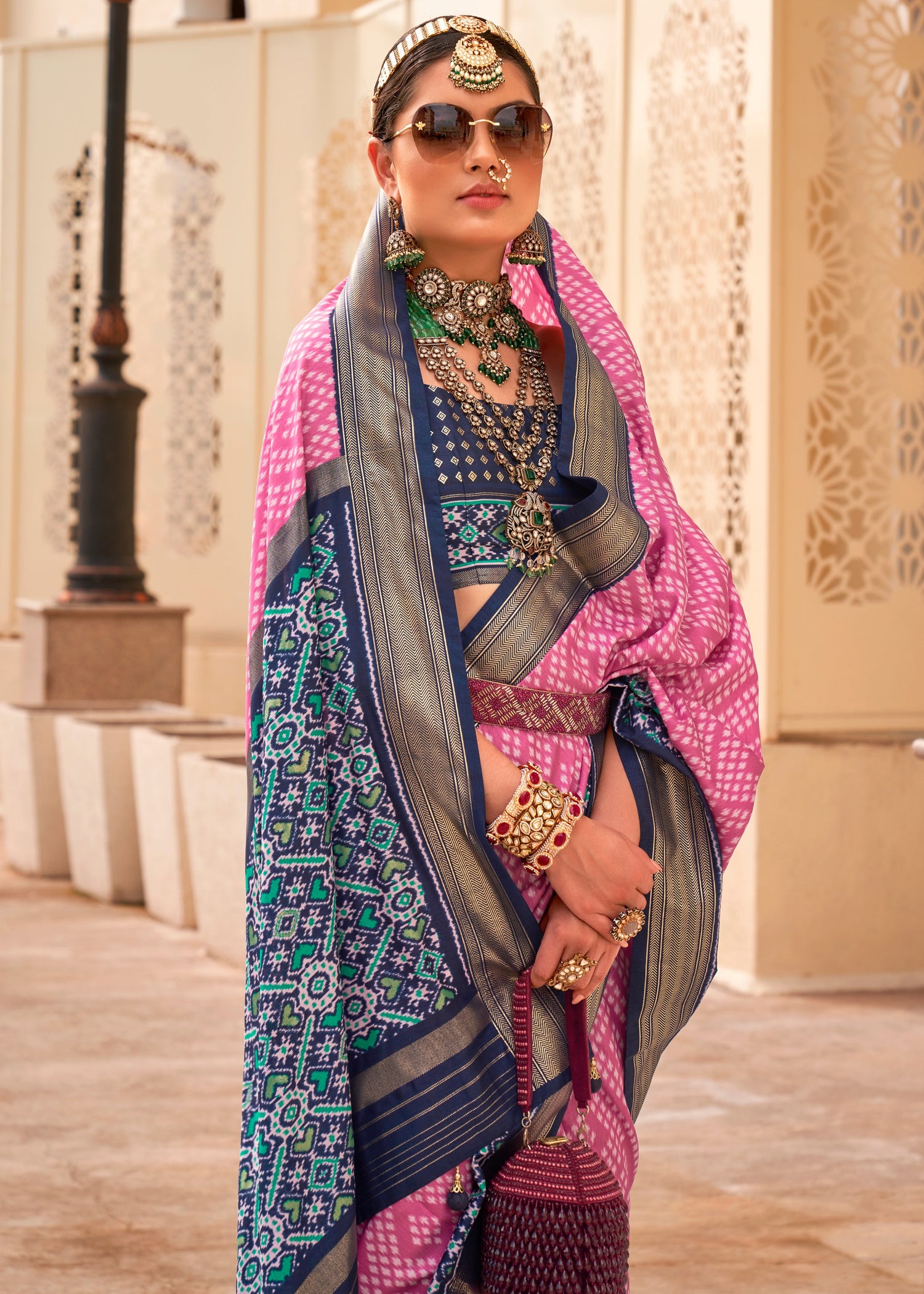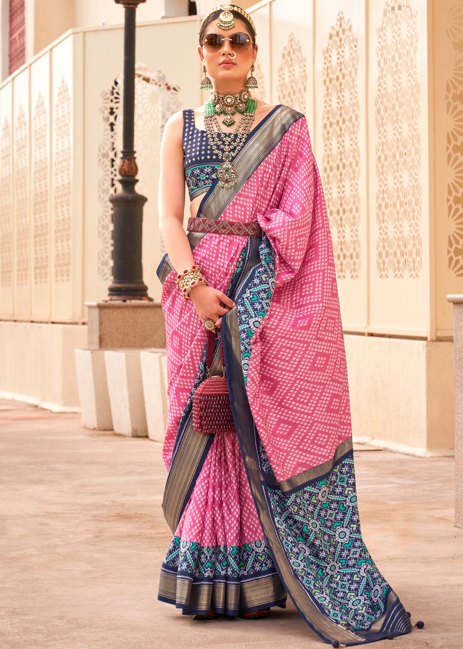 Soft yet rich in texture, the saree drapes effortlessly, offering both comfort and style. Whether you're attending a traditional ceremony or a special event, this Pastel Pink Patola Silk Saree with Contrast Navy Blue Blouse is sure to make a lasting impression.