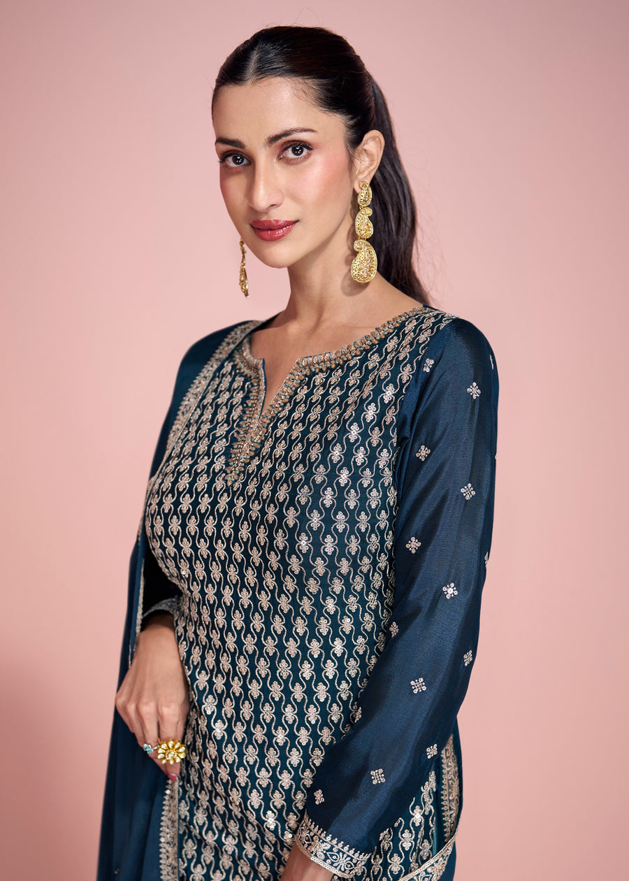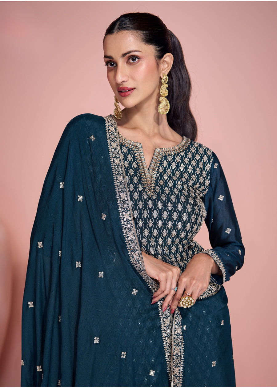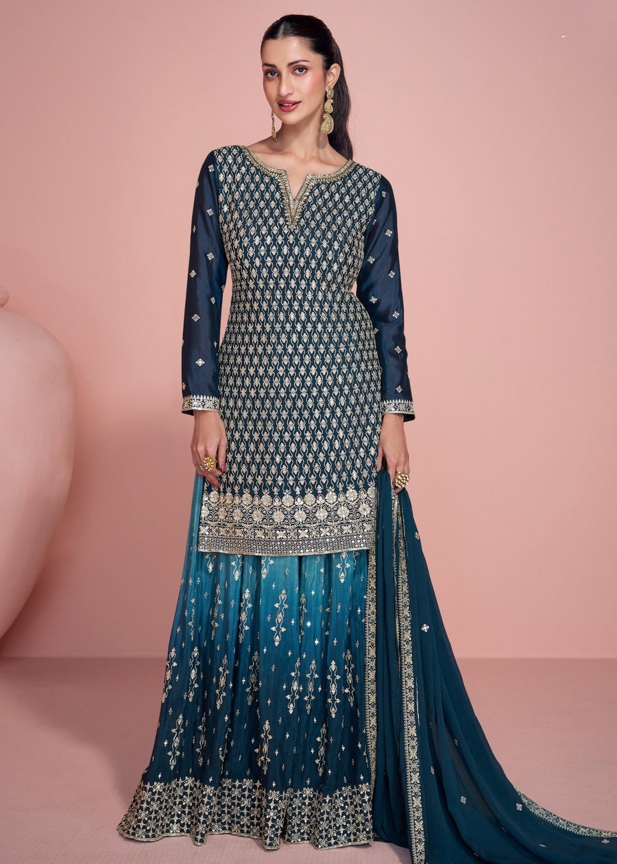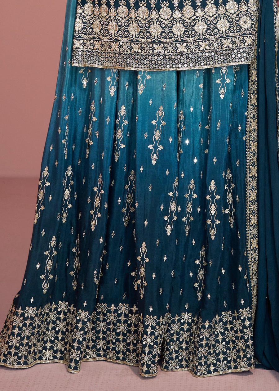 Peacock Blue Readymade Ombre Chinon Silk Sharara Suit Set