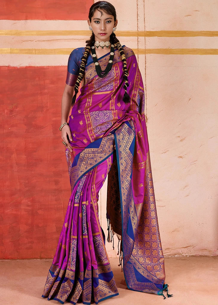 Pochampally Patola Silk Magenta Pink Ikkat Saree with Dark Blue Border