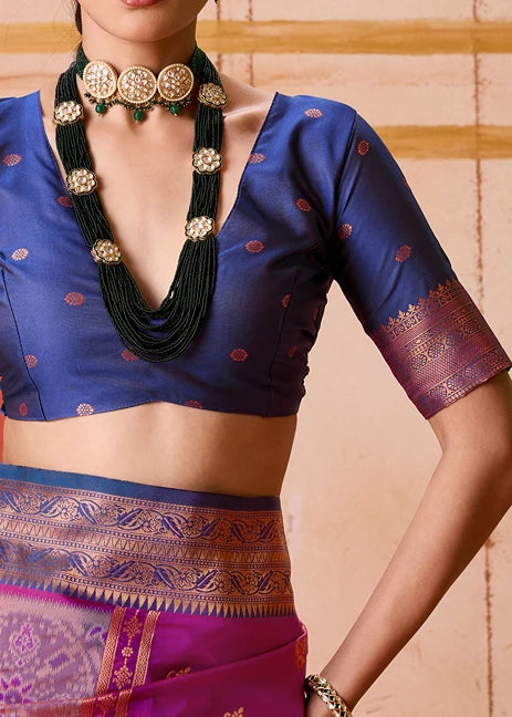 The vibrant magenta pink color is perfectly complemented by the dark blue border, adding a touch of sophistication and elegance. Whether you're attending a wedding, party, or festival, this saree is sure to make you stand out from the crowd.