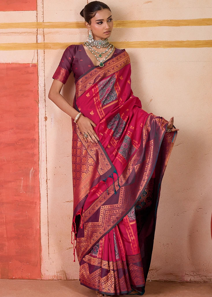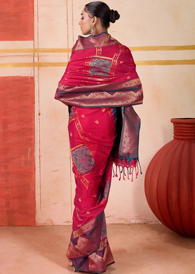 Make a statement in this stunning Pochampally Patola Silk Red Ikkat Saree with Burgundy Border. The bold red color and intricate Ikkat weave exude traditional elegance, while the luxurious Patola silk adds a touch of sophistication. Perfect for weddings and grand celebrations, this saree combines cultural heritage with timeless beauty.