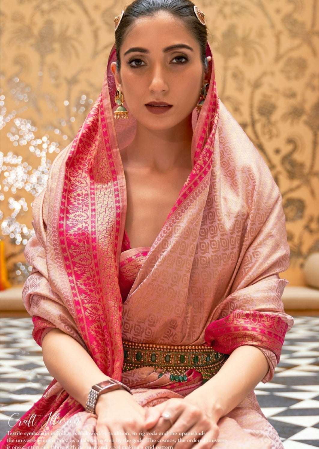 A radiant color palette in striking dual tones and vibrant hues - introducing our zari woven handloom kanjivaram silk saree collection to you. This pretty vintage saree comes in shades of a pastel pink with engaging golden and rose pink contrasting tones. Beautifully crafted with rich weaving, this saree is a classic essential having exquisite detailing done to create this masterpiece.