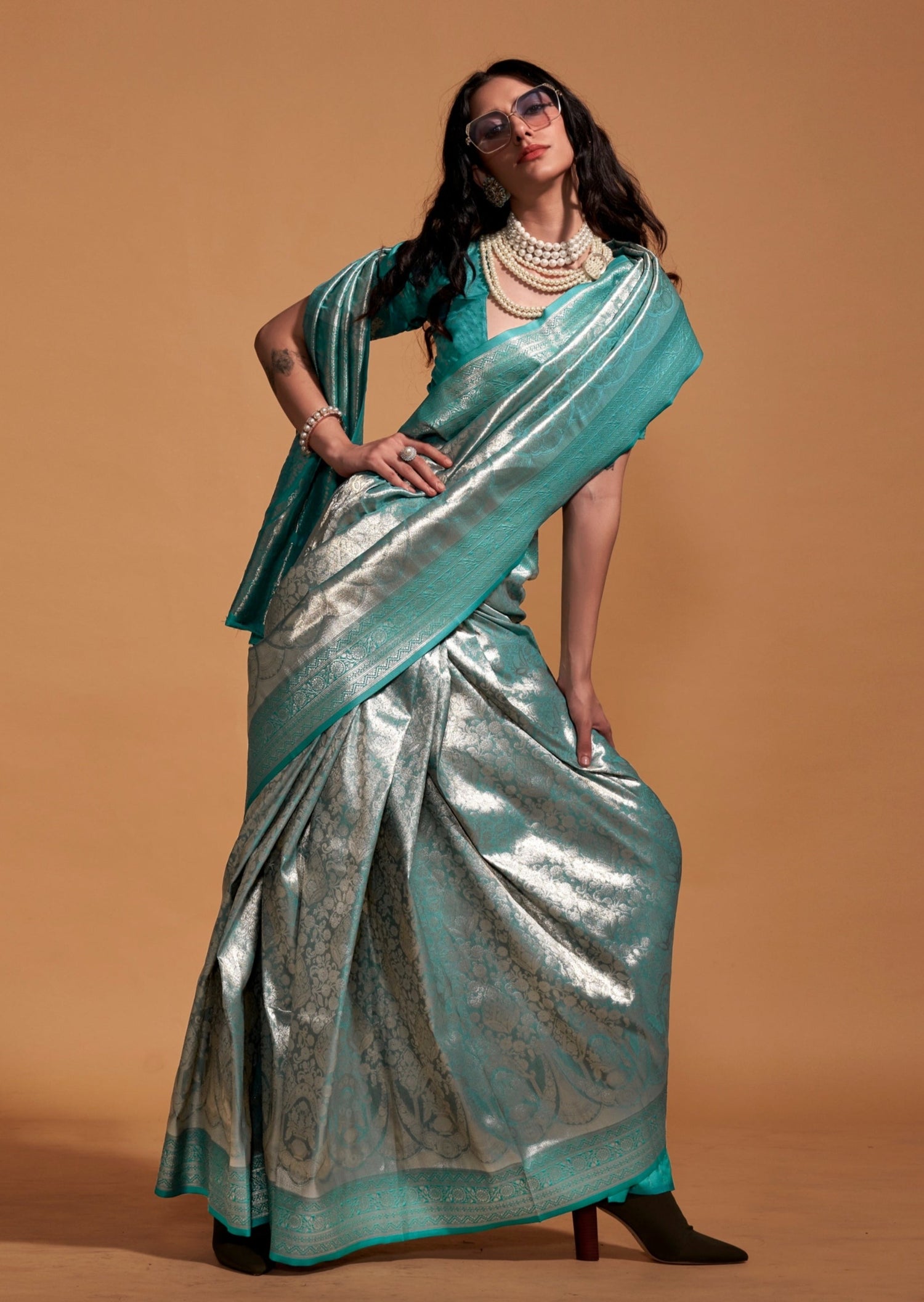 Pure Handloom Kanjivaram Silk Teal Blue Bridal Saree (Green Undertone)