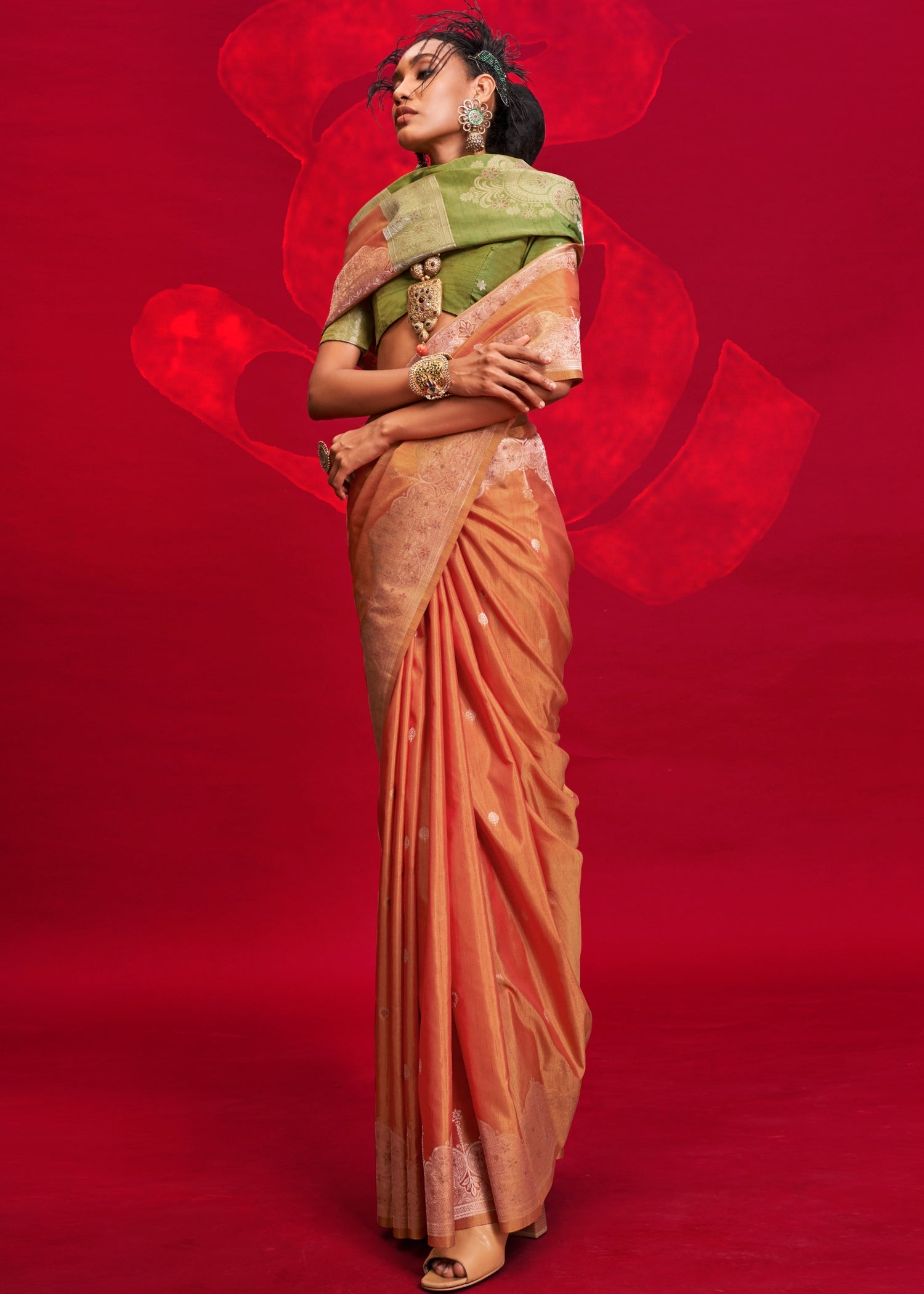 Pure Handloom Tussar Silk Orange Saree With Green Blouse