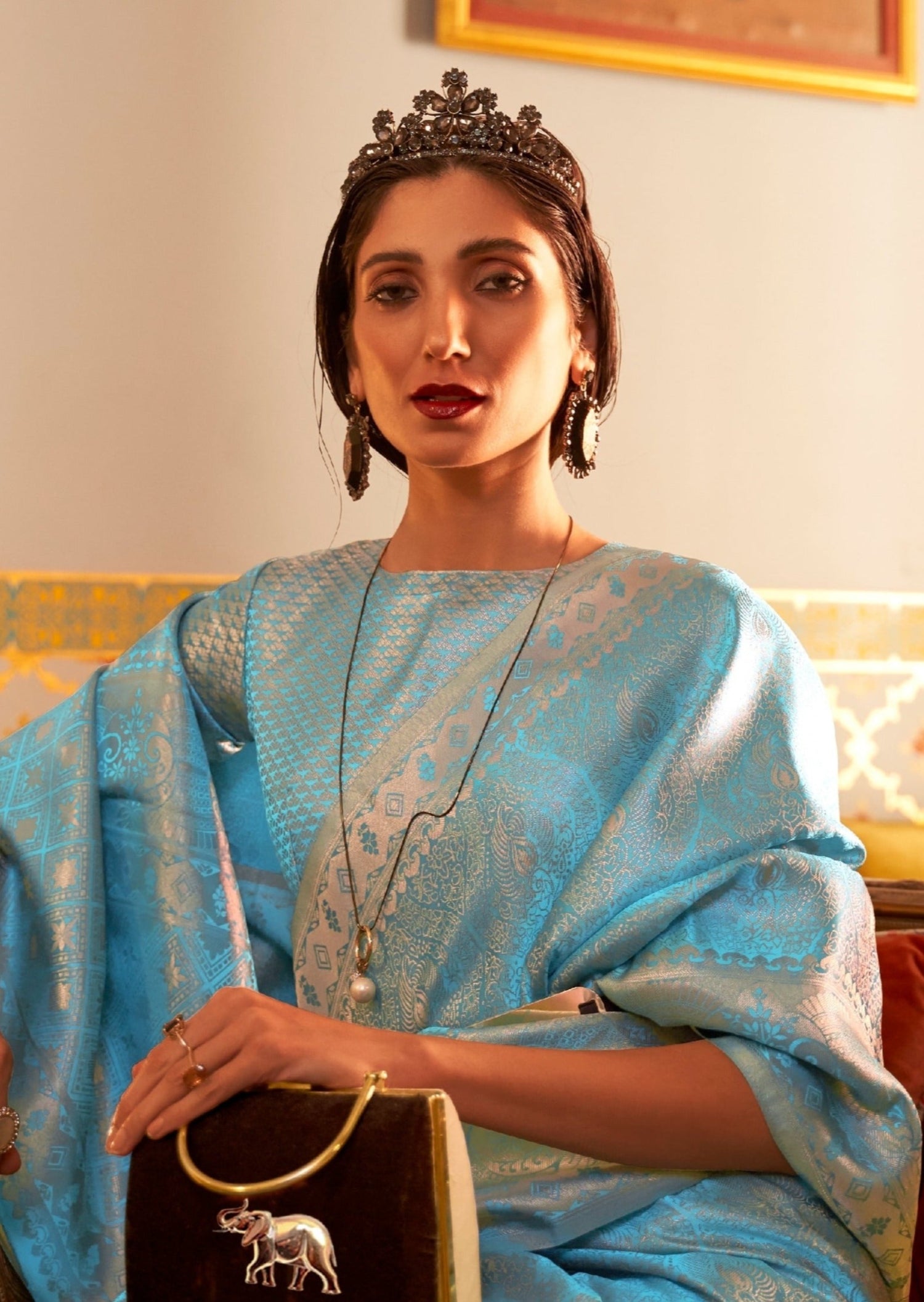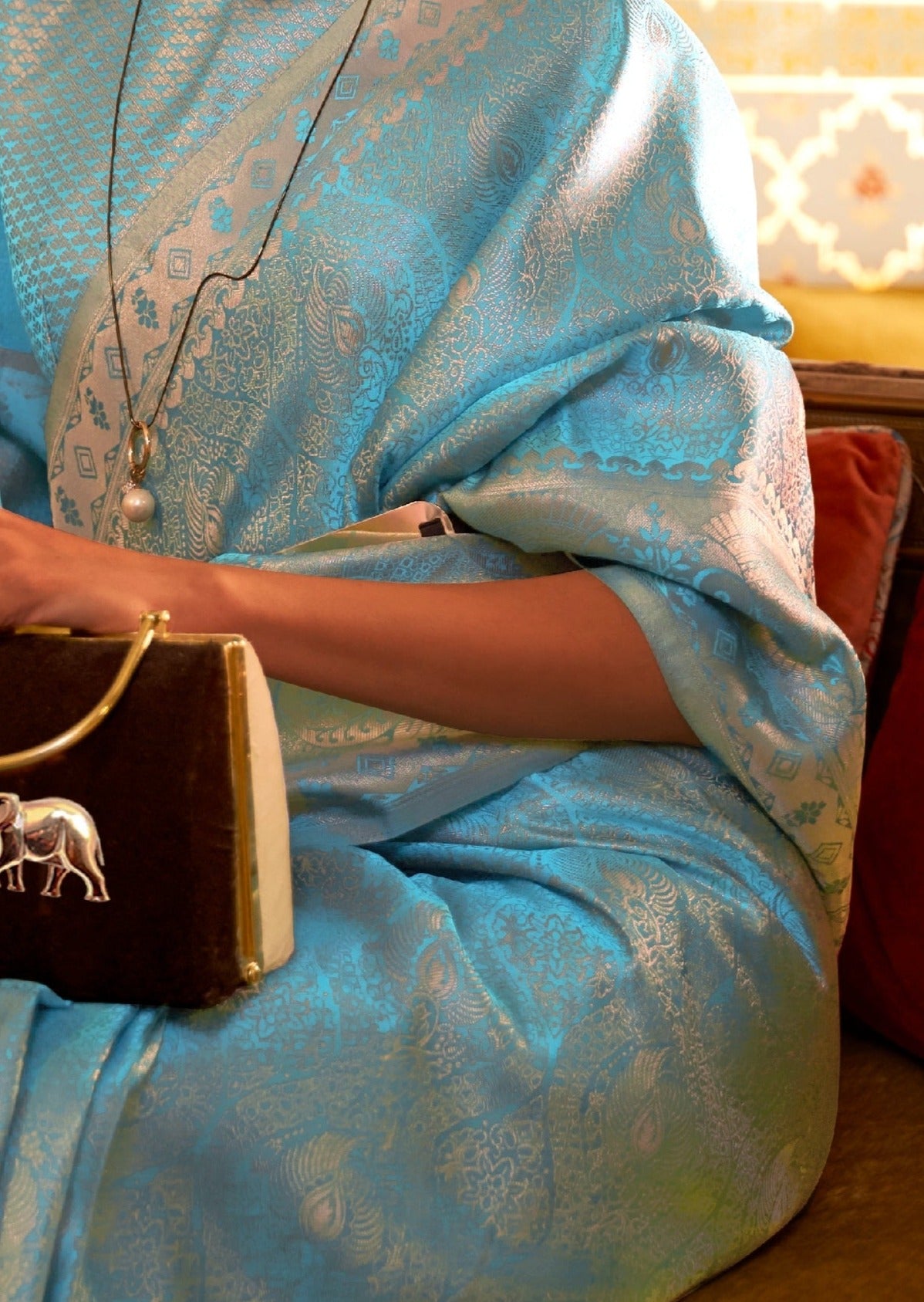 This marvelous masterpiece from Kanchipuram is a traditional bridal kanjivaram silk saree, having gorgeous zari woven details on it. This gorgeous blue silk saree carries a sense of sophistication and elegance which are beautifully achieved by our highly skilled weavers. Months of karigari and skillfulness has resulted in this beautiful saree. The pallu illustrates beautiful Mughal Bootas which emerged as the dominant motif in Mughal era.